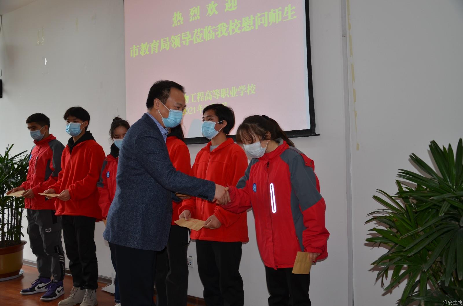 2月5日,淮安市委教育工委书记、市教育局局长皇甫立同,副局长谷玉红、胡金浪及相关处室领导一行莅临淮安生物工程学校慰问新疆内职班师生。校党委书记、校长崔步银,副校长李慧陪同慰问。