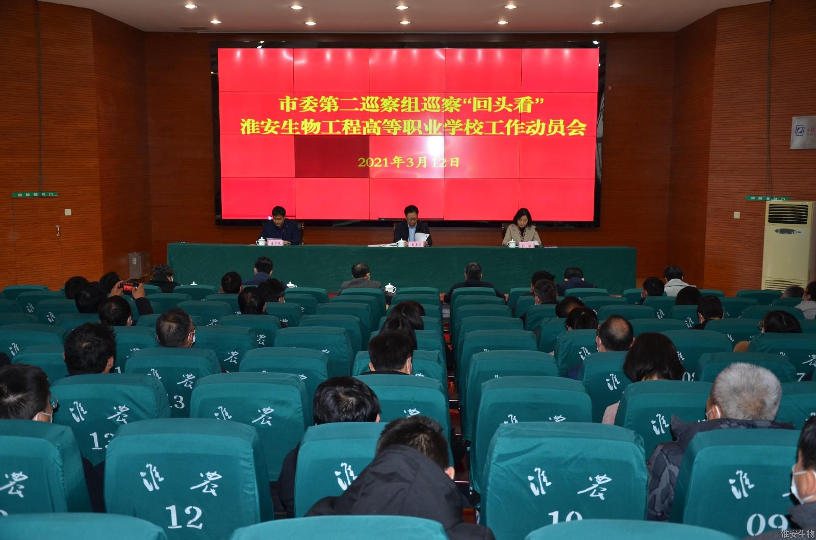 根据市委统一部署,3月12日下午,市委第二巡察组巡察淮安生物工程高等职业学校(以下简称生物工程学校)党委工作动员会在生物工程学校多功能报告厅召开。会前,市委第二巡察组组长赵春虎主持召开了与生物工程学校党委书记、校长崔步银的见面沟通会,通报了本轮巡察任务和工作安排,传达了中央和省市委关于巡察工作的新部署新要求。动员会上,赵春虎就即将开展的巡察工作作了动员讲话。崔步银主持会议,并作了表态发言。