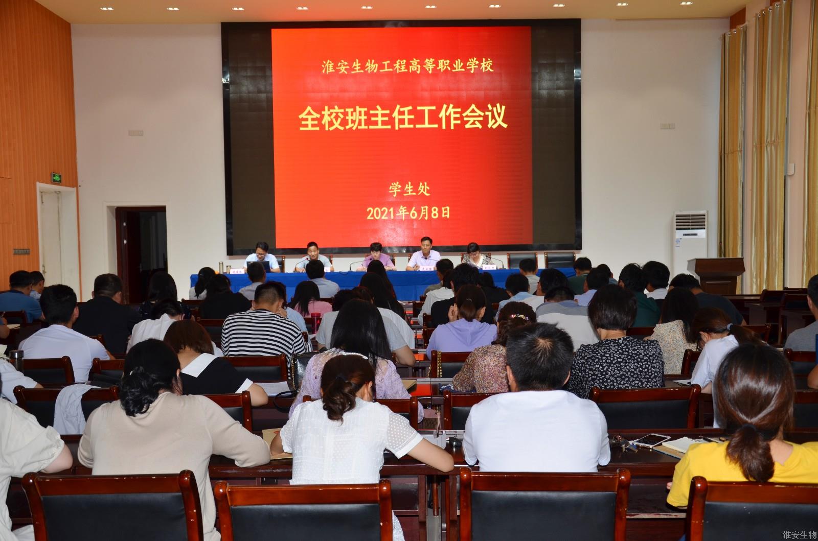 淮安生物工程学校学生处于6月8日下午在新农业实训楼124会议室组织召开全校班主任会议。副校长李慧出席会议并讲话。学生处处长史云国,保卫处处长仲春雷,学生处副处长胡春林、宣文秀,各系部学管主任、班主任参加了会议。会议由胡春林主持。