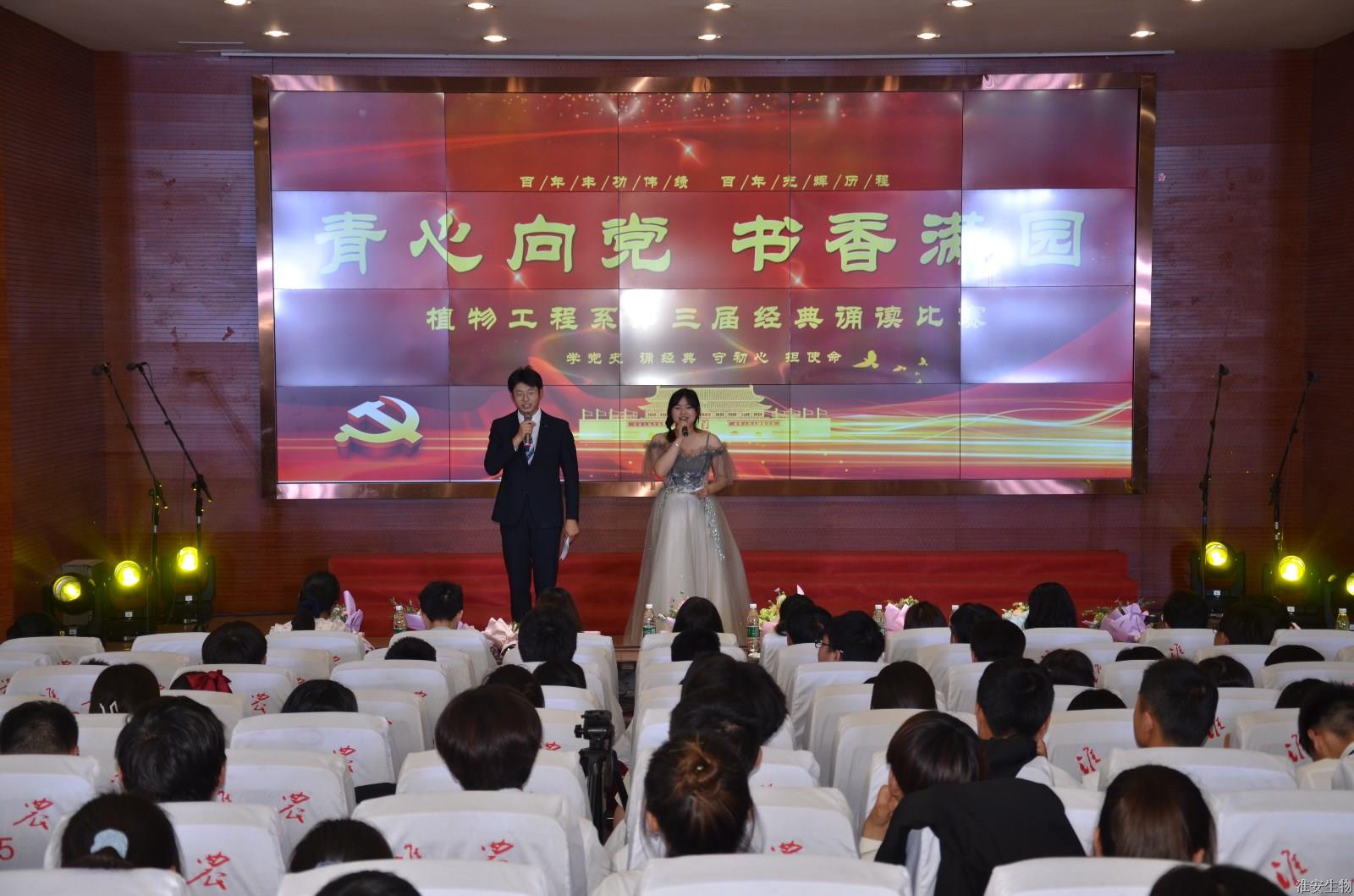为隆重庆祝中国共产党成立100周年,重温党的光辉历程,讴歌党的光辉历史和丰功伟绩,践行“百年淮农 耕读传世”的精神,6月9日下午,淮安生物工程学校植物工程系在报告厅成功举办主题为“青心向党 书香满园”经典诵读比赛。校党委书记、校长崔步银,副校长李慧出席活动。植物工程系主任徐暄、校团委副书记张澍、学生处副处长胡春林、各系部教师代表以及植物工程系全体学生和班主任参加了活动。