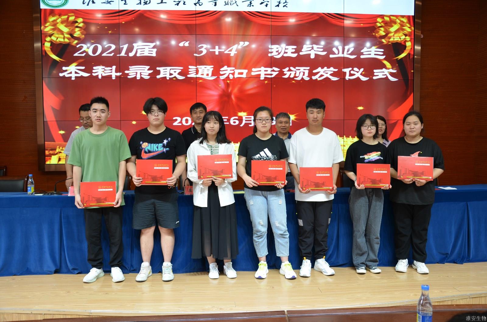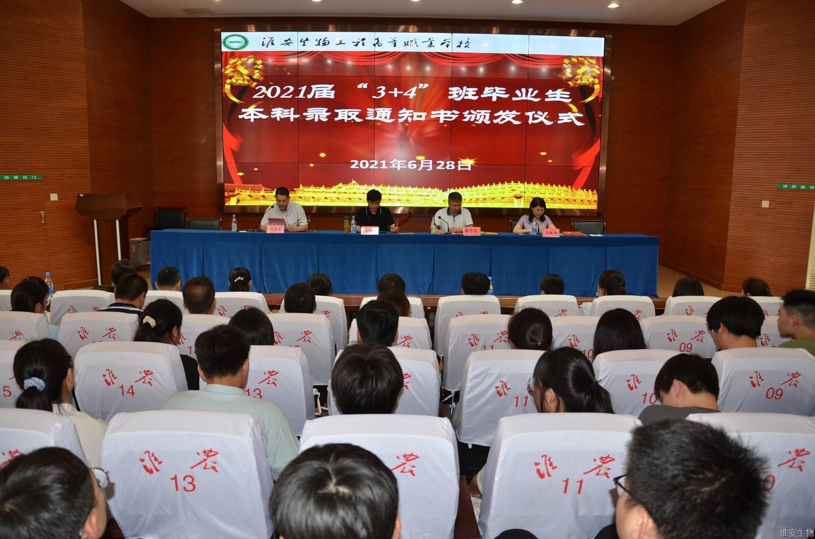 6月28日上午,淮安生物工程学校在多功能报告厅举行2021届“3+4”班毕业生本科录取通知书颁发典礼。校党委书记、校长崔步银,副校长赵守东,教务处处长史忠良,基础课部副主任彭敏玲,“3+4”班毕业生及家长参加了本次活动。活动由教务处处长史忠良主持。