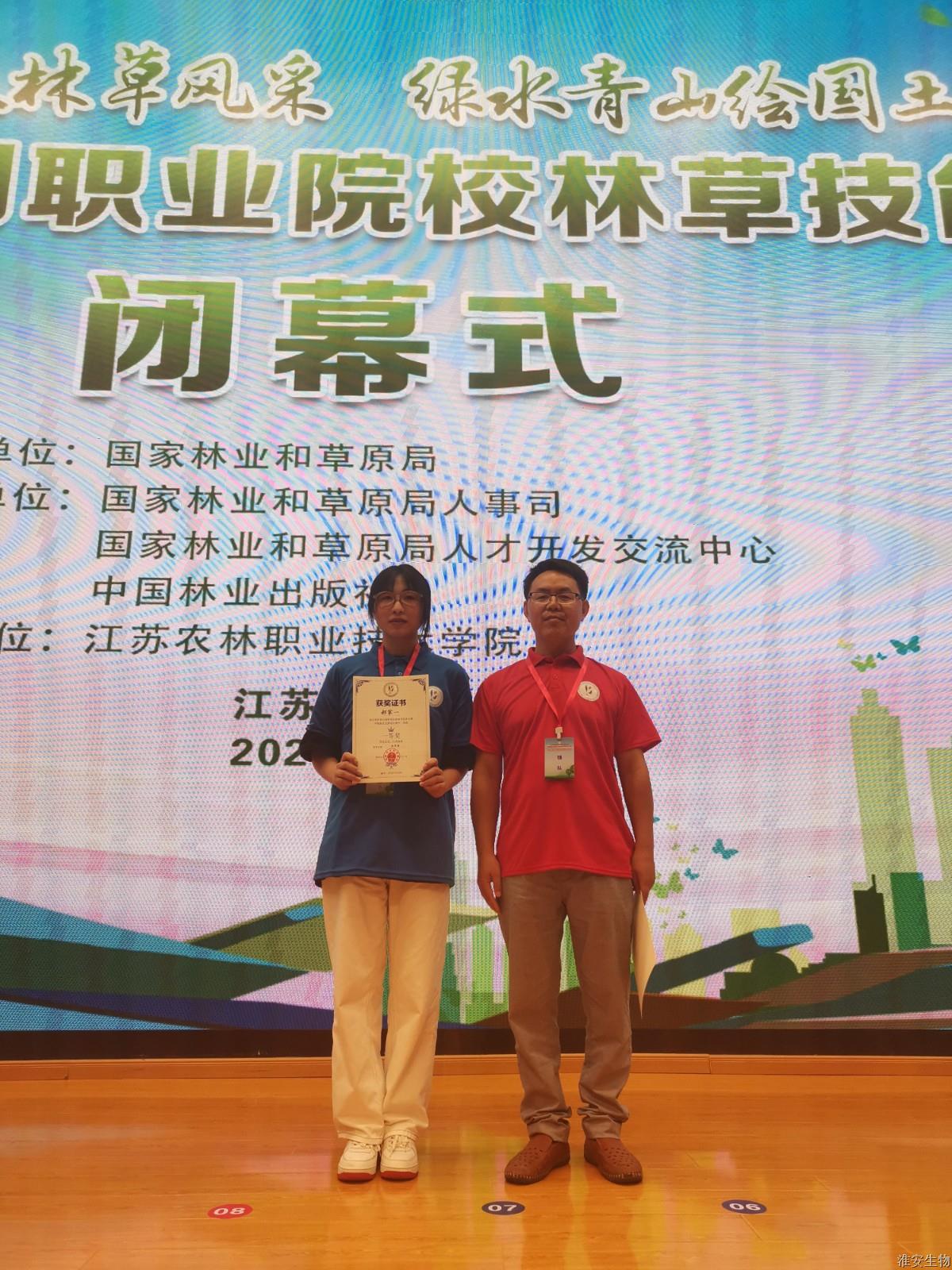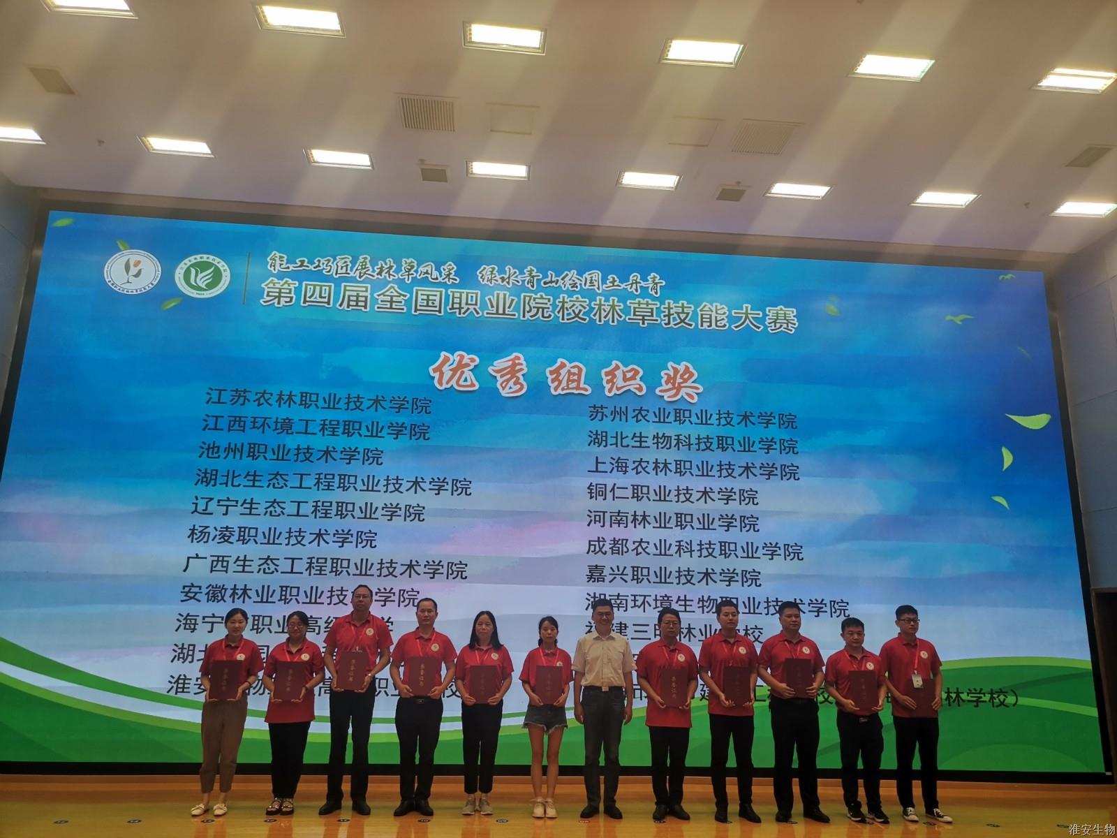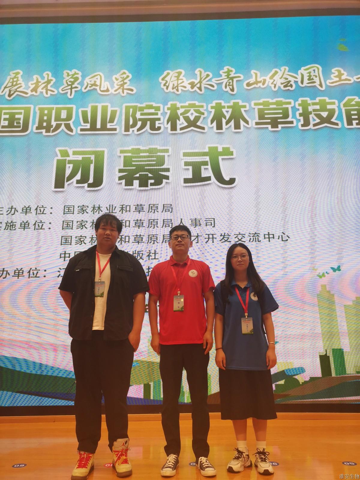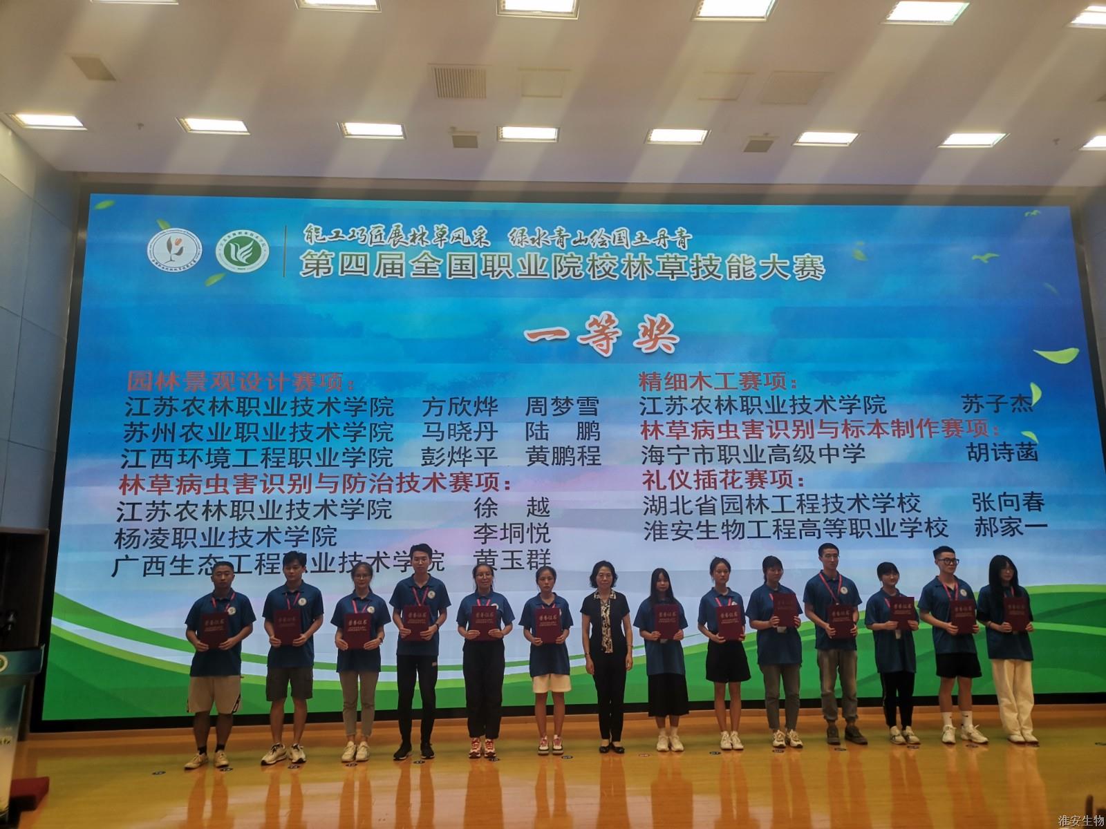 7月10日至12日第四届全国职业院校林草技能大赛在句容顺利举行。经过激烈角逐,淮安生物工程学校郝家一同学获得礼仪插花赛项一等奖,吉梨同学获林草病虫害识别与标本制作赛项三等奖,李楠檑同学和徐艺婷同学获园林景观设计赛项(高职团体)三等奖。伍华丽老师获优秀指导教师。淮安生物工程学校获优秀组织奖。