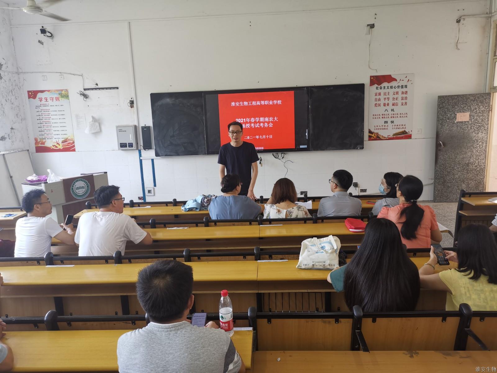 根据南京农业大学继续教育学院教学工作安排,淮安生物工程学校作为南京农业大学函授站,于7月10日、11日组织了2020级、2021级春学期课程考试。7月10日上午,南京农业大学继续教育学院院长李友生、党总支副书记毛卫华、招生办公室主任董志昕、教务科科长徐风国在淮安生物工程学校副校长禹立馨和成教处副处长高宋伟等人的陪同下对考试现场进行巡视。在巡视过程中他们认真查看了学生身份证、同学们答题情况、监考教师履职、考生纪律、考场环境等方面。从考试巡查情况来看,学校函授课程期末考试工作管理规范,监考老师认真负责,考场环境干净整洁,考风考纪良好,考场井然有序,深得南农大领导好评。