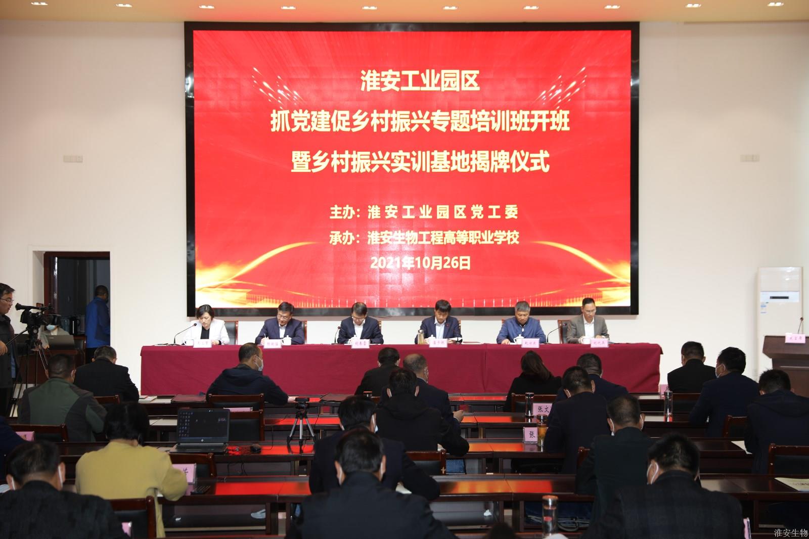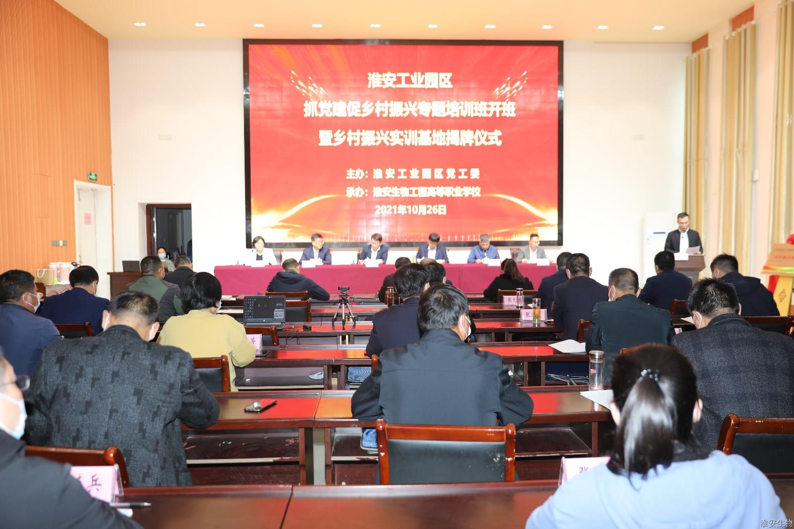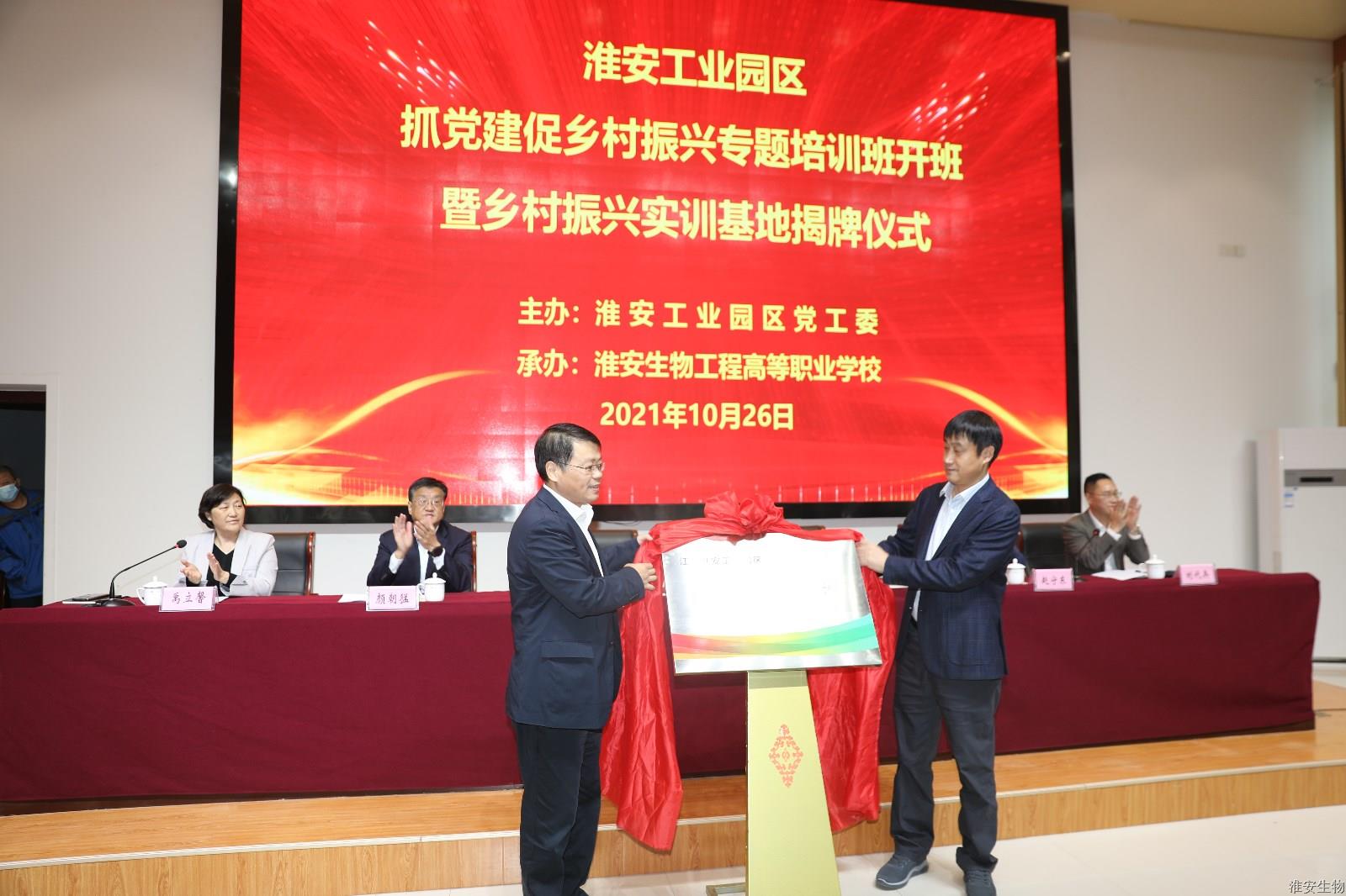 为深入贯彻新时代党的建设总要求和党的组织路线,落实中组部《关于抓党建促乡村振兴的若干意见》(中组发【2021】8号)和《关于大力发展新型农村集体经济不断深化抓党建促乡村振兴的意见》(淮组通【2021】33号),全面提升农村基层党组织的政治功能、服务功能和发展功能,不断夯实党在农村执政基础,不断发展壮大新型农村集体经济、促进农民共同富裕,深入实施“抓党建促双增”(村集体经济增收、集体资产增值)计划,10月26日上午,淮安工业园区在我校举办“抓党建促乡村振兴”专题培训班暨乡村振兴实训基地揭牌仪式。淮安工业园区副书记胡春雷、党群工作部部长颜朝猛,淮安生物工程高等职业学校党委书记、校长崔步银、副校长赵守东、禹立馨、淮安翔宇乡村研究院院长刘代兵出席仪式。仪式由禹立馨主持。