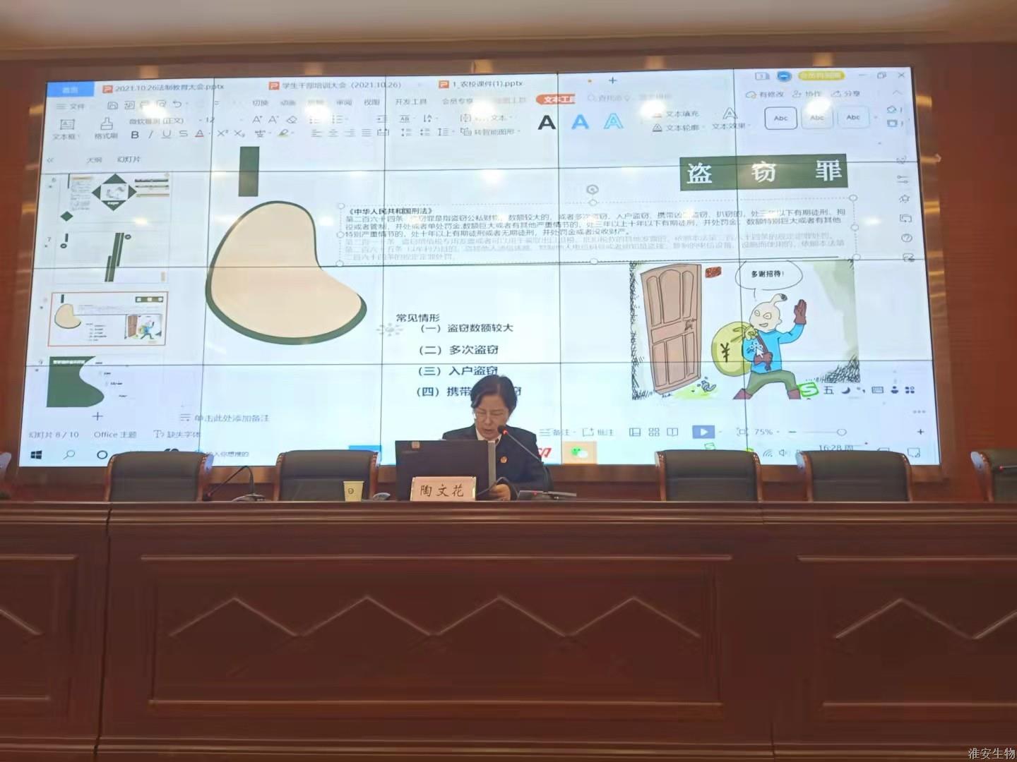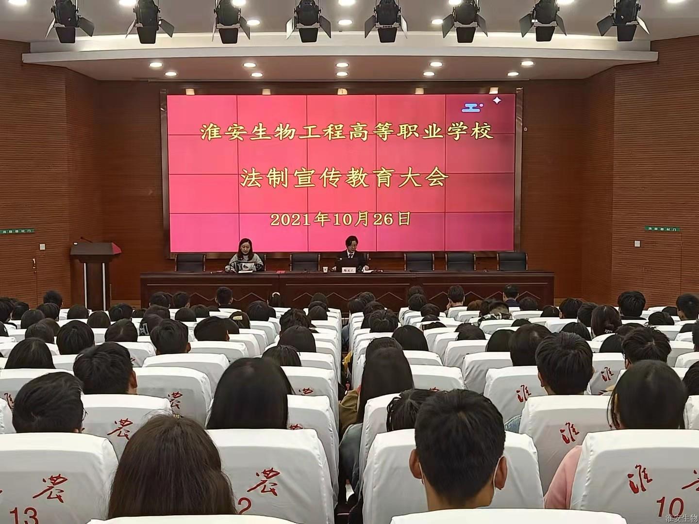 为提高我校学生的法律意识,大力弘扬法治精神,创建和谐校园,10月26日下午4点在多功能报告厅举行以《青春与法》为主题的法制宣传教育大会。大会特别邀请了淮安区法院陶文花庭长作为主讲人。
