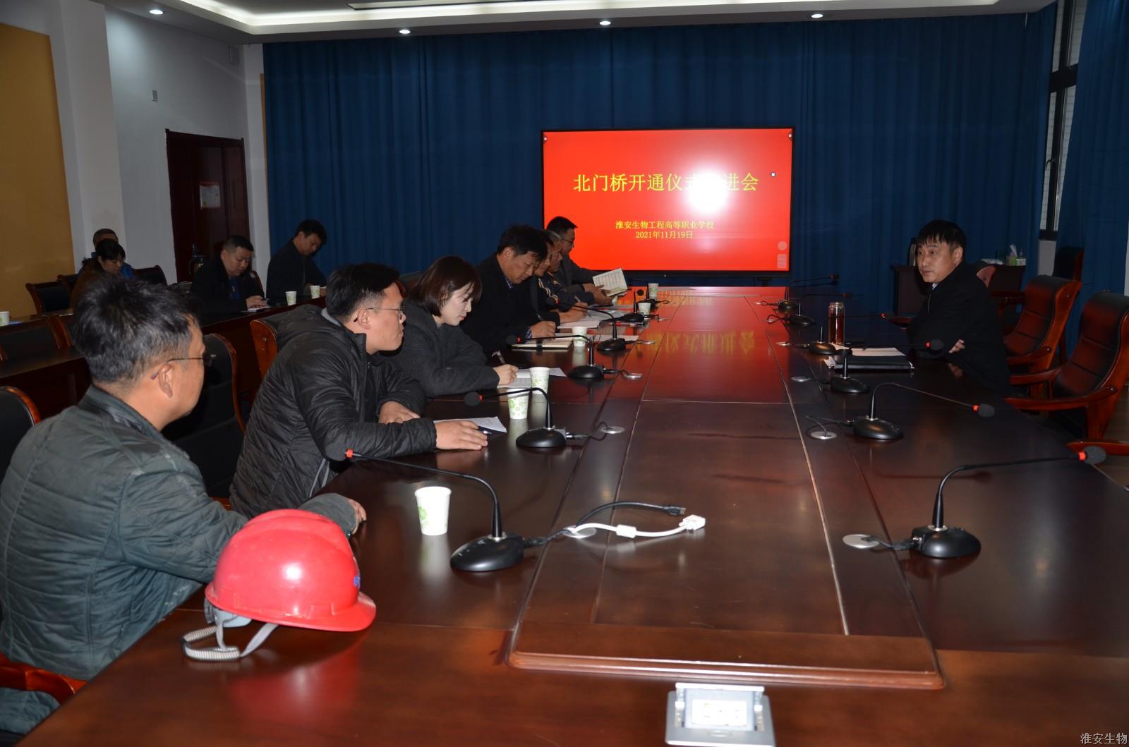 2021年11月19日下午,淮安生物工程学校北门桥开通仪式推进会在119会议室召开。校党委书记、校长崔步银主持会议并讲话,副校长周其林和相关处室负责人出席会议。