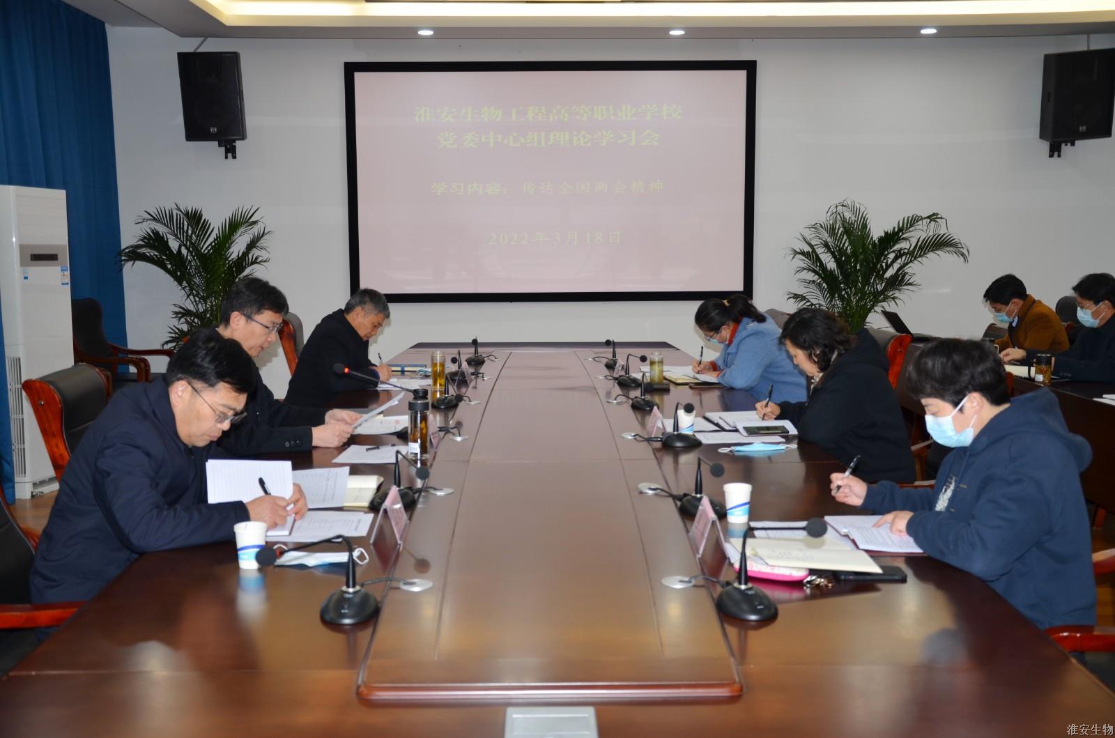 3月18日上午,淮安生物工程学校在新农业实训楼119会议室召开党委中心组学习会,学习全国两会精神。校党委领导班子成员出席会议,校党委书记、校长韩永胜主持会议并讲话。