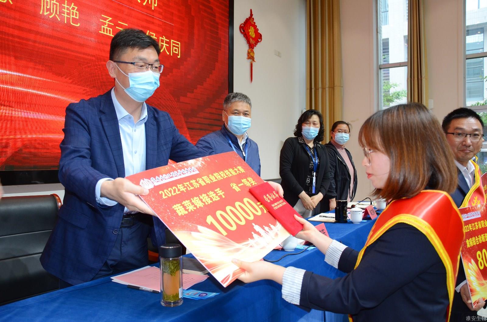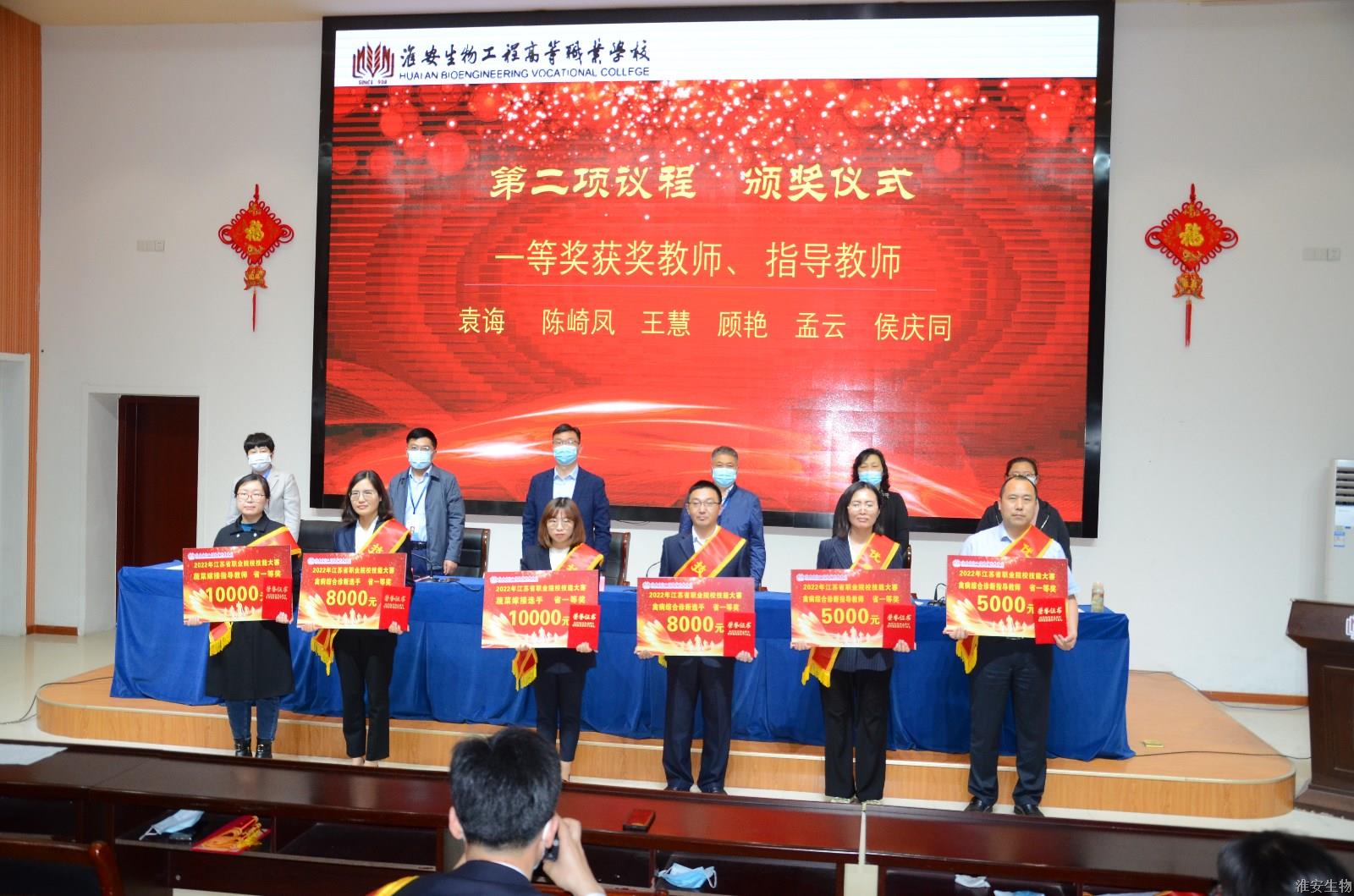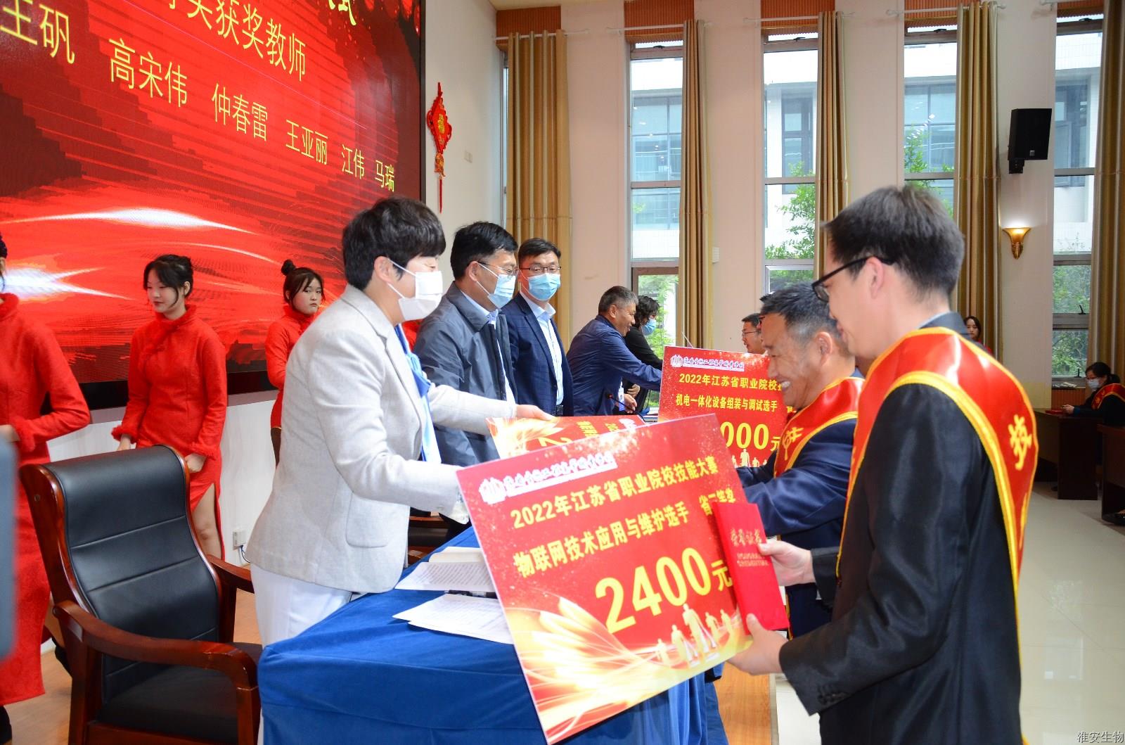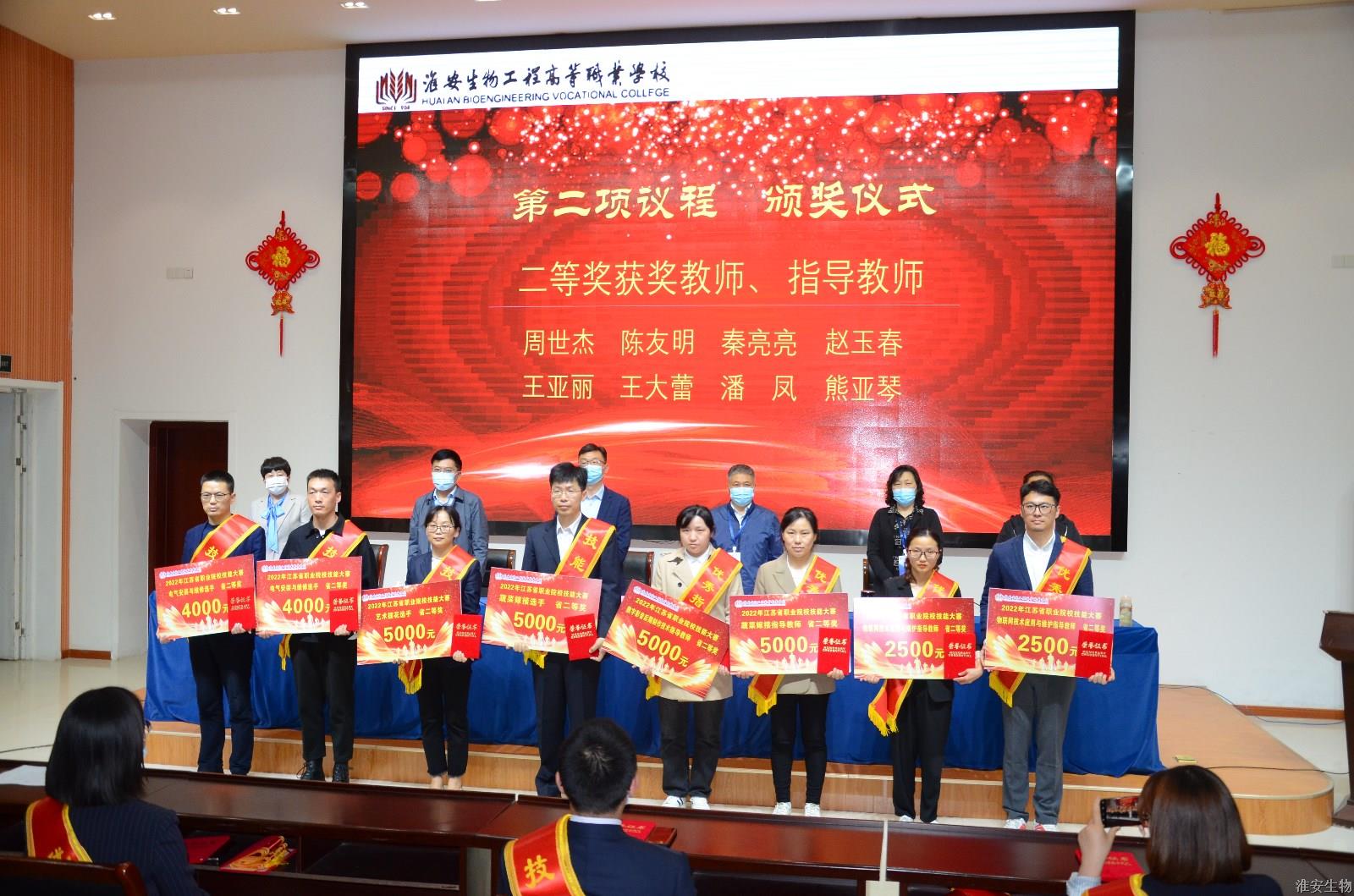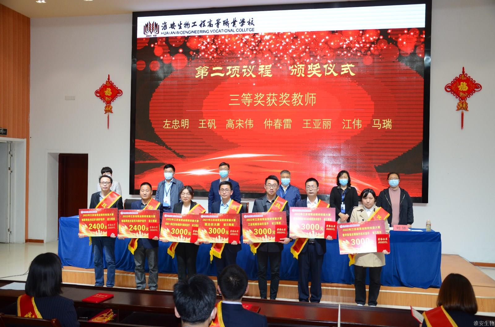 会议的第一项议程由校党委副书记石国安宣读学校关于表彰2022年省技能大赛获奖教师、学生和指导教师的表彰决定。为表彰先进、树立典型,激励全体教师和学生,经校党委研究决定,授予袁诲等3名同志“技能名师”称号、周世杰等4名同志“技能标兵”称号、马瑞等7名同志“技能能手”称号、顾艳等13名同志“优秀指导教师”称号、丁玉等7名学生“学生技能标兵”称号、陈怀旺等8名学生“学生技能能手”称号。在欢快的乐曲声中,校领导为受表彰的教师、学生颁发了奖金和荣誉证书。