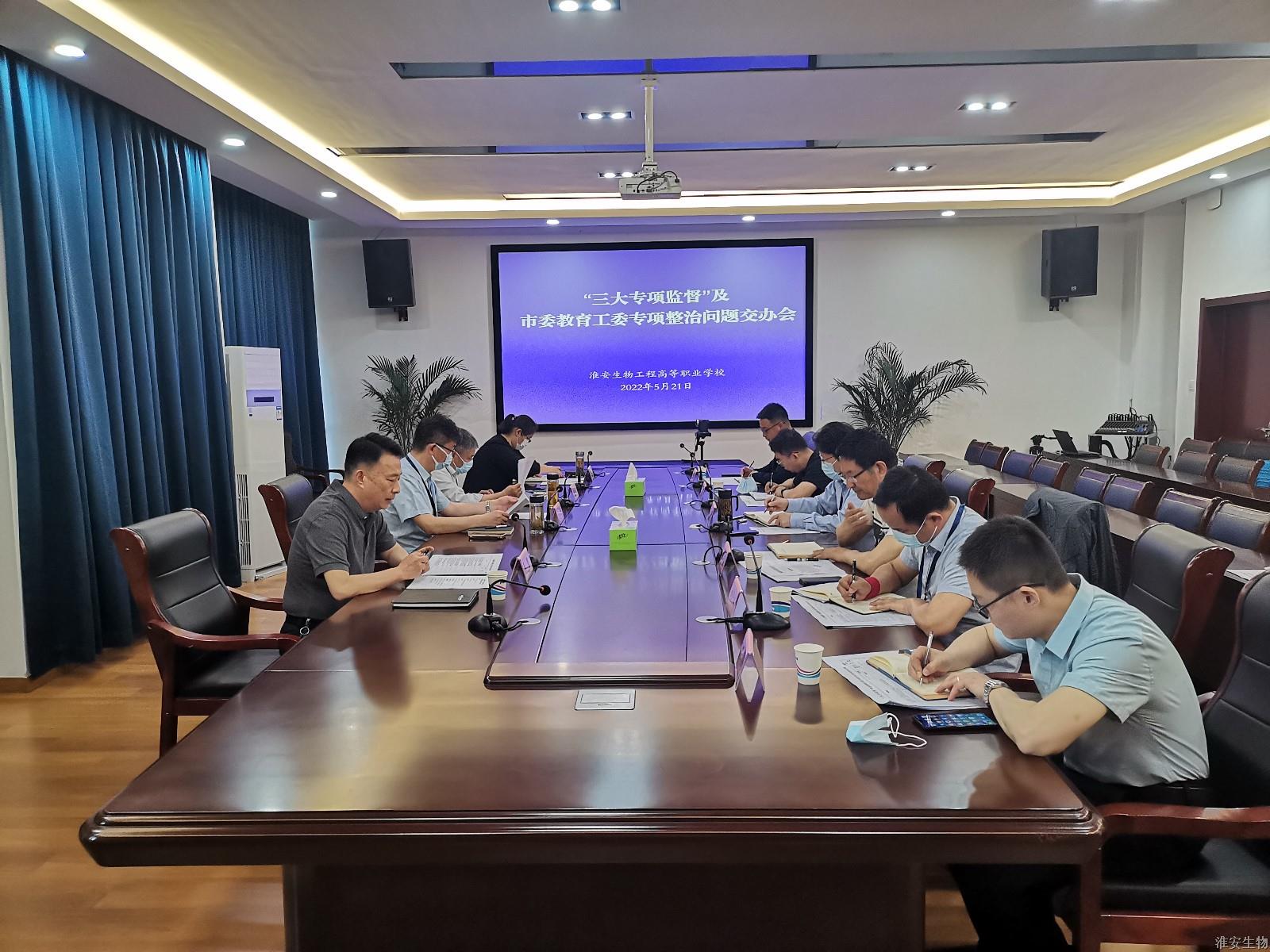 5月21日上午,淮安生物工程学校在农业实训楼119会议室召开了“三大专项监督”及市委教育工委专项整治问题交办会议,校党委书记、校长韩永胜,副校长赵守东,副校长刘慧及相关部门主要负责同志出席会议。会议由校纪委书记王坚主持。