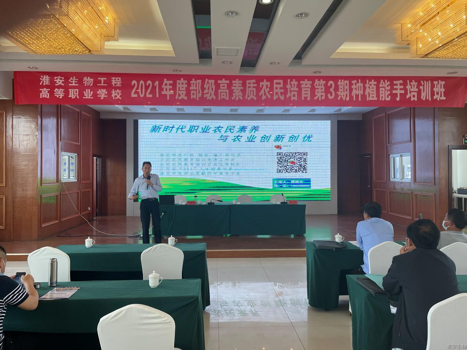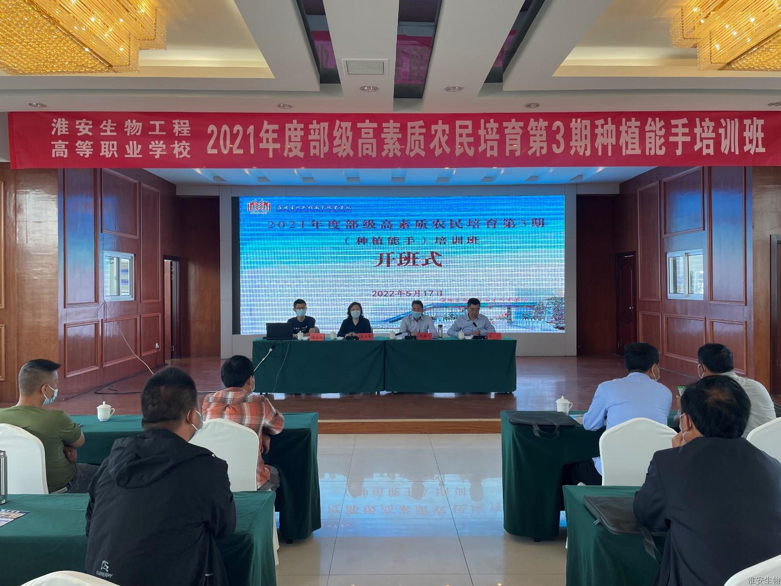 5月17日上午,由淮安生物工程高等职业学校举办的“2021年度部级高素质农民培育第3期种植能手培训班”在淮安宾馆如期开班。开班仪式由学校成教处处长吴松主持,副校长禹立馨致辞,并为培训班学员介绍了我校悠久的办学历史,近年来我校在校园基建、师资队伍、技能大赛、办学效果等方面取得的喜人成绩,鼓励广大学员认真学习,通过培训掌握新技能在农业生产实践中大显身手。淮安市农广校校长邢国文对参训学员提出培训要求,他希望参训学员能珍惜本次学习机会,认真听取专家授课,相互交流,进一步提高自己的本领,争当新型职业农民的排头兵。