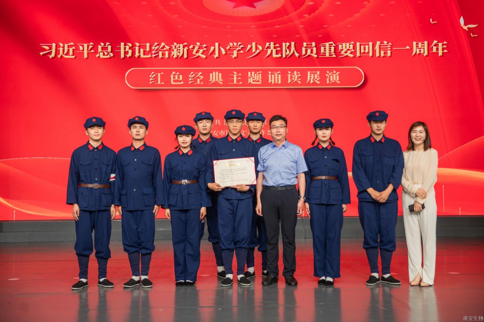5月29日下午,“习近平总书记给新安小学少先队员重要回信”一周年红色经典主题诵读比赛揭晓,淮安生物工程学校学生诵读作品《军礼》荣获特等奖。颁奖仪式和优秀作品展演在市广电台演播大厅举行。