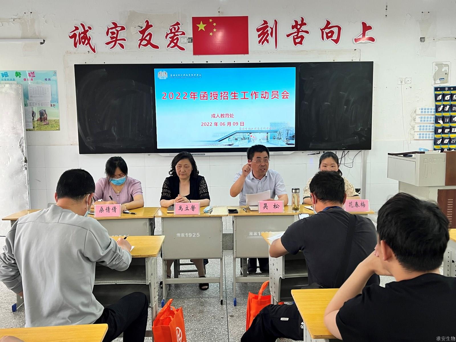6月9日下午,淮安生物工程学校在精进楼105教室召开2022年度函授招生工作动员会。副校长禹立馨、成教处处长吴松、副处长桑倩倩、办事员花春梅、2017级和2018级班主任参加了会议。会议由成教处处长吴松主持。