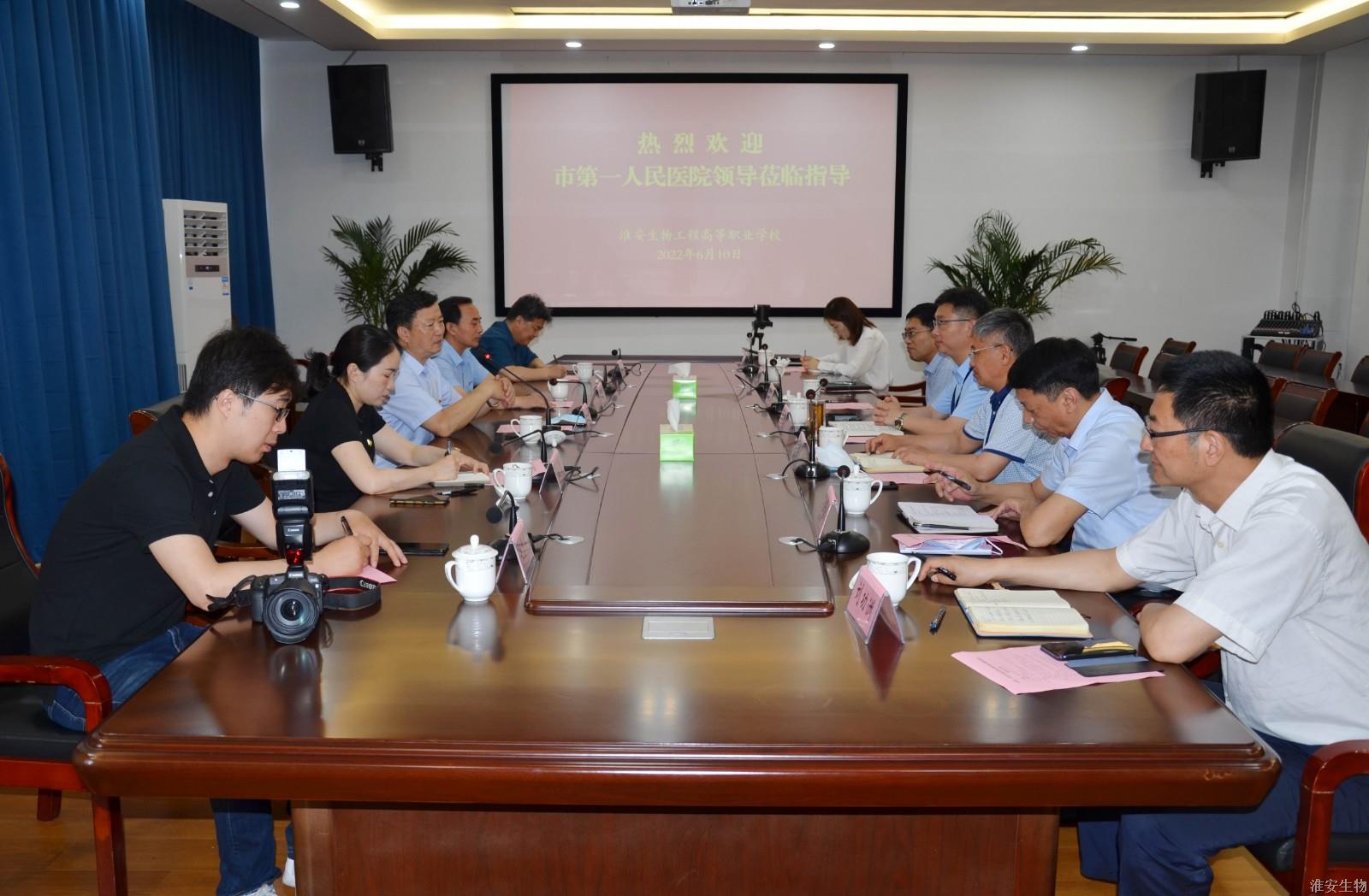 6月10日上午,淮安市第一人民医院党委书记、医学博士徐克平一行来到淮安生物工程学校考察交流。淮安市第一人民医院党委副书记石西洋、党委办公室主任宋倩、宣传处处长王树文随行来访。淮安生物工程学校党委书记、校长韩永胜,副校长赵守东,校党委副书记石国安,以及相关处室负责人陪同考察。