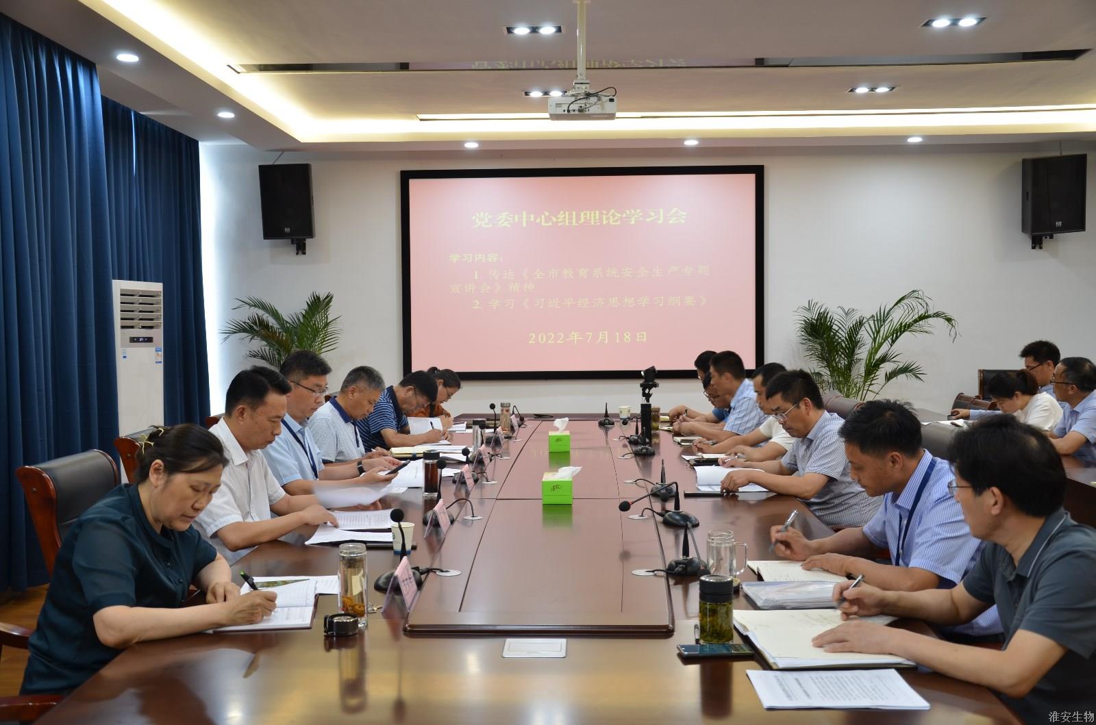 7月18日下午,淮安生物工程学校在农业实训楼119会议室召开党委中心组学习会,学习《全市教育系统安全生产专题宣讲会》、《习近平经济思想学习纲要》。校党委领导班子成员,各处室、系部负责人参加会议,校党委书记、校长韩永胜主持会议。