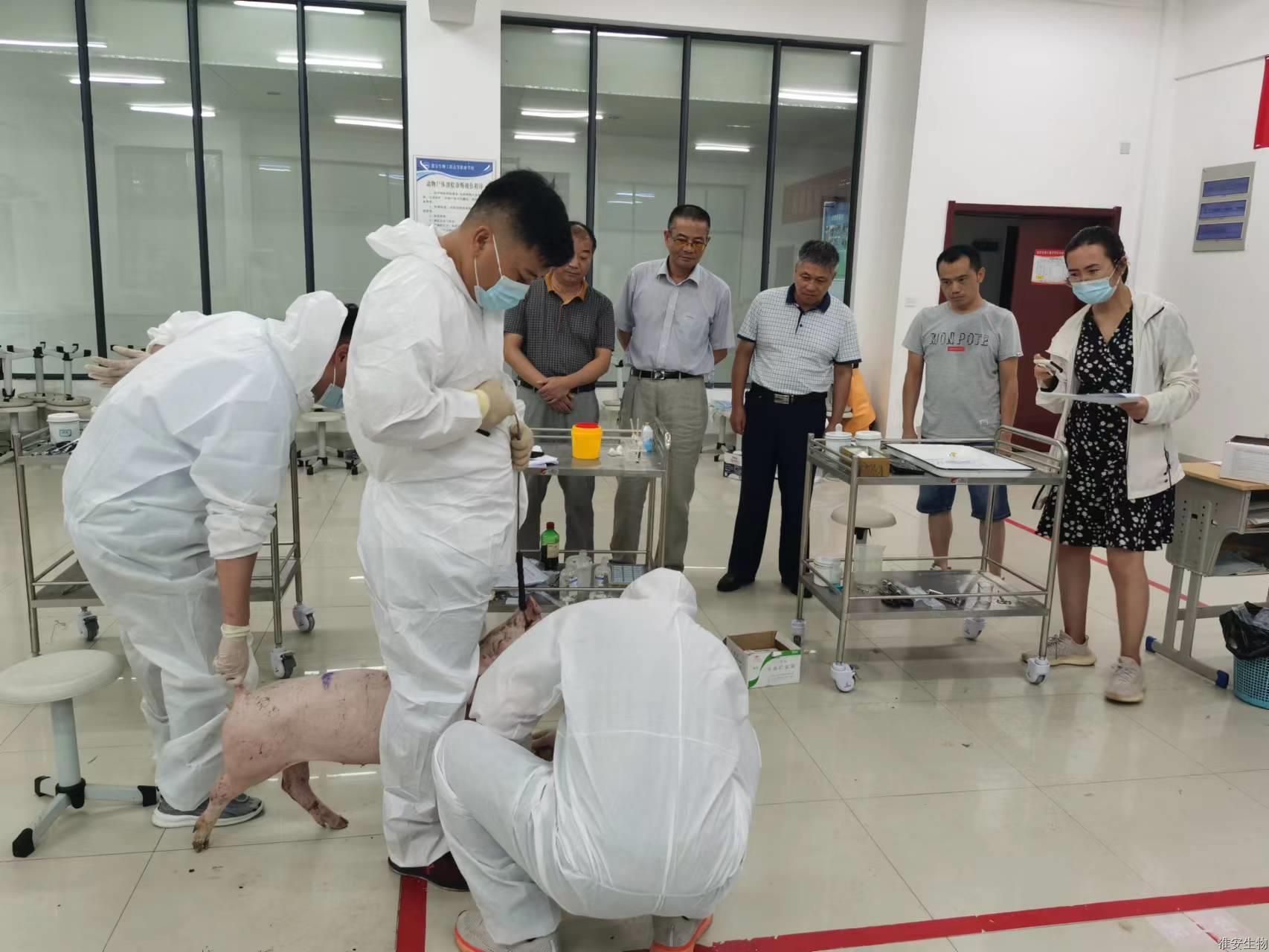 2022年8月19日,淮安市农业农村局周伟丁副局长、淮安市动物疫病预防控制中心蒋锁俊主任来我校看望参加江苏省动物疫病防治员技能大赛集训的三名选手,赵守东副校长、动物工程系陈剑主任陪同检查了三名选手的集训情况。