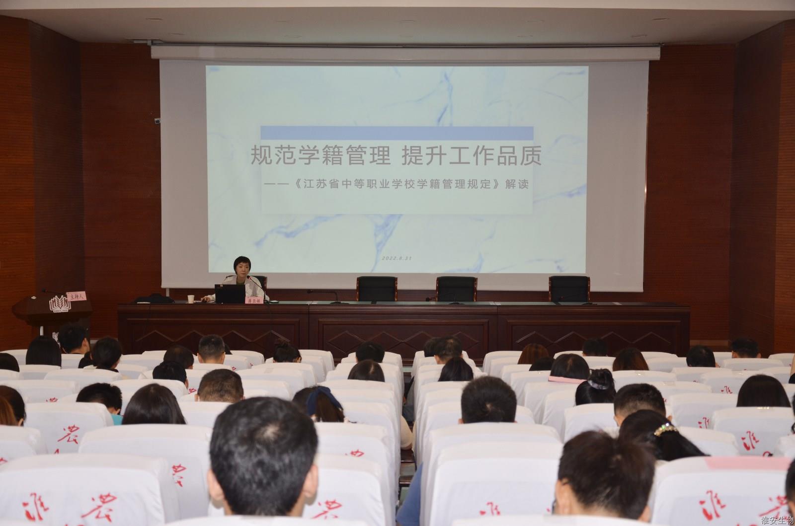 最后场次培训是由淮安市教育局职社处分管中职德育、学籍管理的蒋亚娅副处长带来的《规范学籍管理,提升工作品质》,讲座中蒋亚娅带领大家深入学习了江苏省中等职业学校学籍管理规定,列举了大量现实案例,详细解说了规定中的各个环节。学籍管理规定是教育部关于高等教育的要求,是经济社会发展的需要,是学校教育与管理的需求,更是保障学生权益,规范学生行为的有力举措。希望各位班主任老师重视配合学籍管理工作,使学校学生档案管理制度化、科学化。充分发挥学生档案在日常教育教学、毕业等方面的作用。