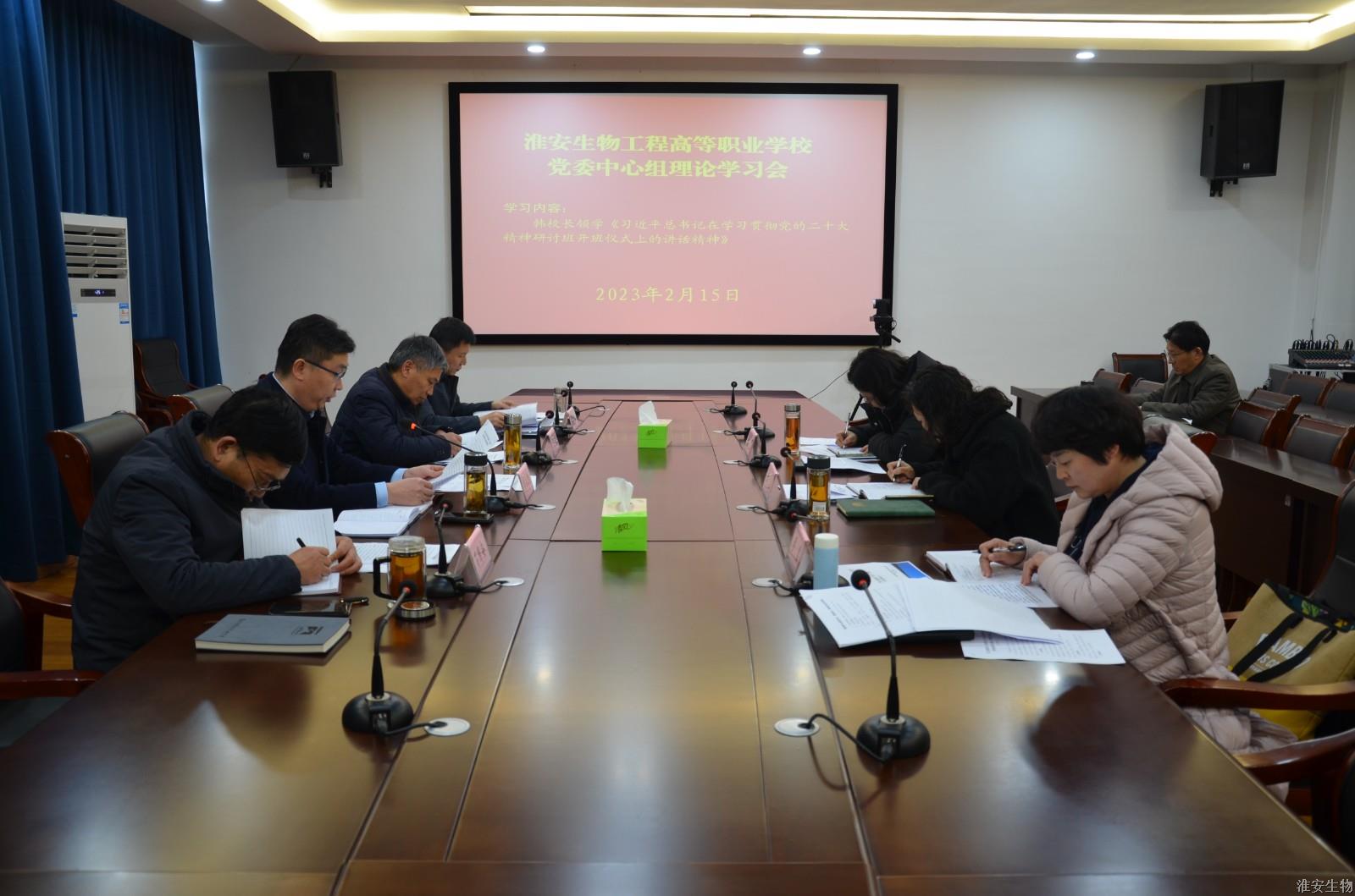 2月15日下午,淮安生物工程高等职业学校在农业实训楼119会议室召开党委中心组学习扩大会,校党委领导班子全体成员,办公室、人事处、工会、财务处、总务处、教务处、学生处、成教处、图文信息中心、基础课部、施河校区主要负责人参加学习会,党委书记、校长韩永胜主持会议。