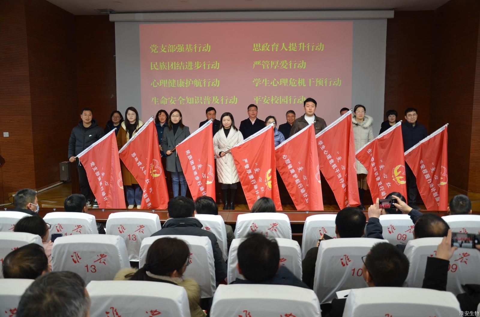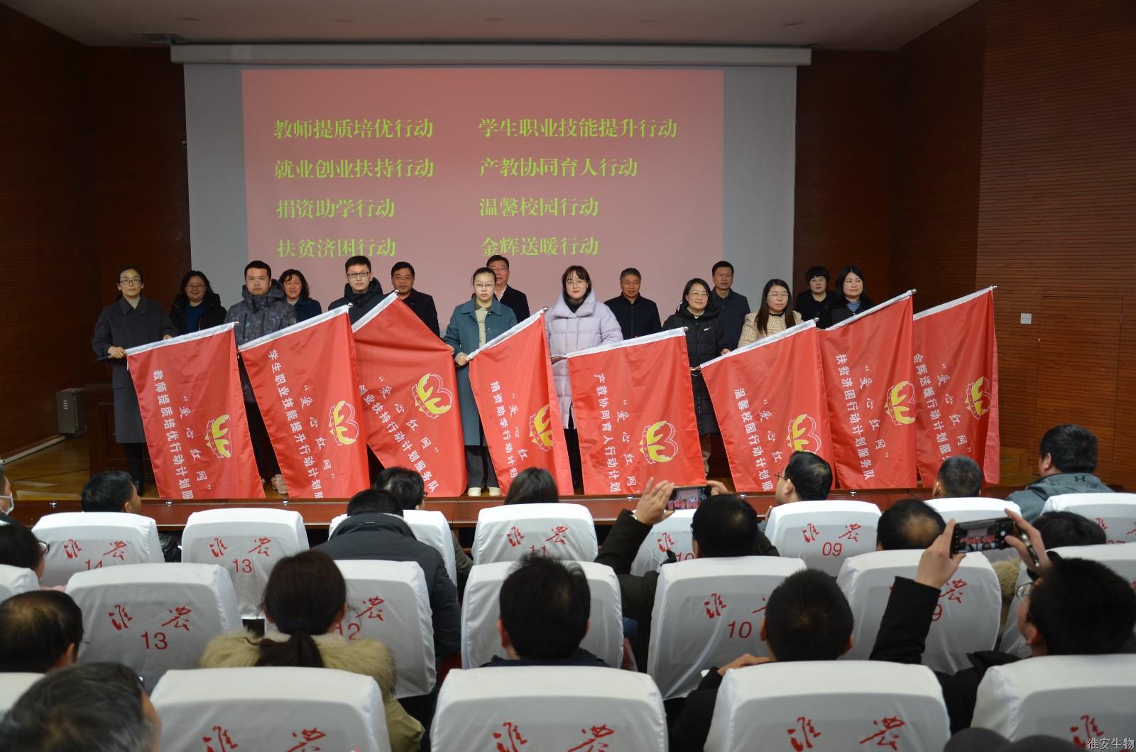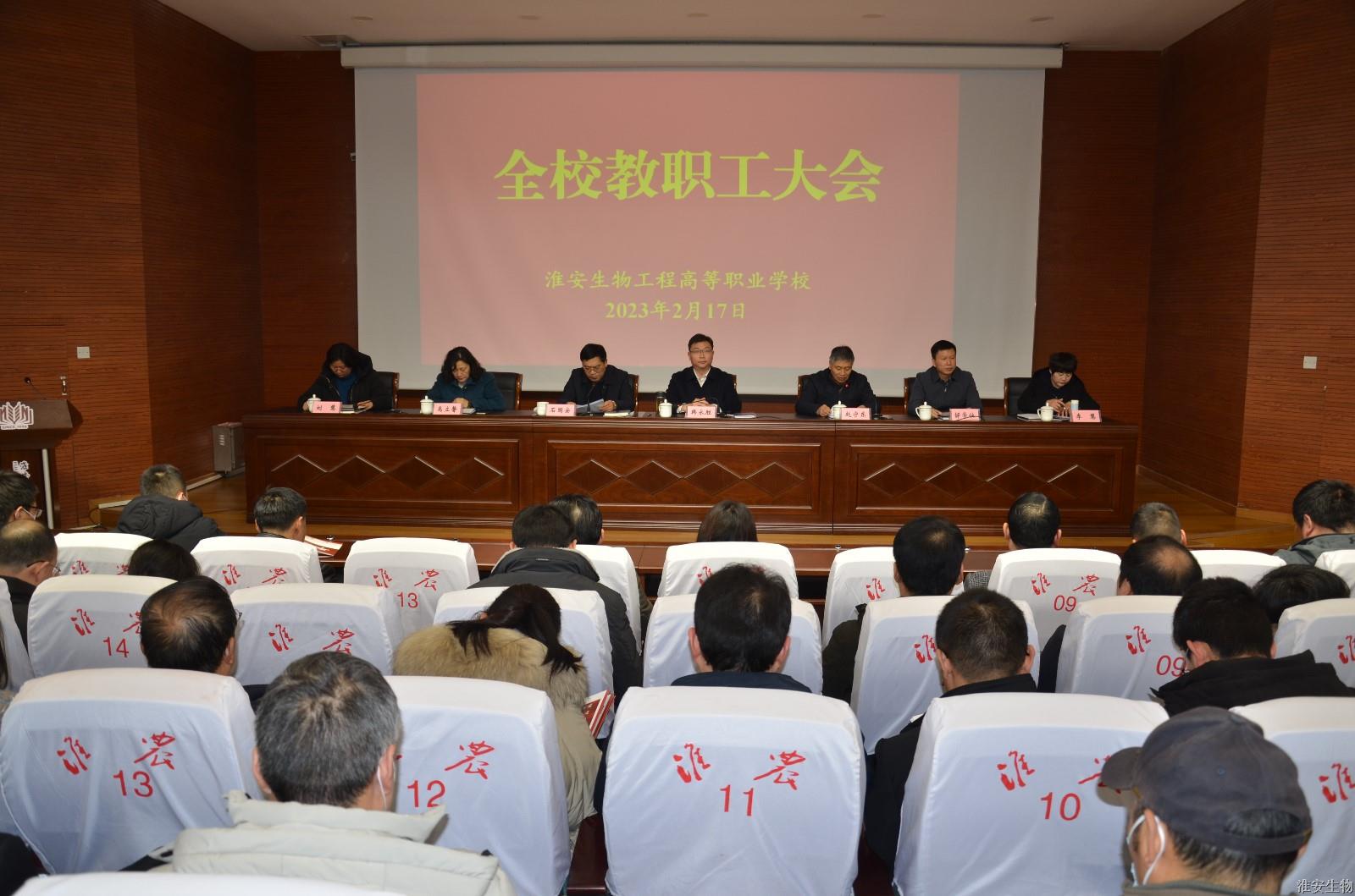 2023年2月17日,淮安生物工程学校召开全校教职工大会。党委书记、校长韩永胜作工作报告,党委副书记石国安作“爱心红网”关爱行动动员讲话,会议由副校长赵守东主持