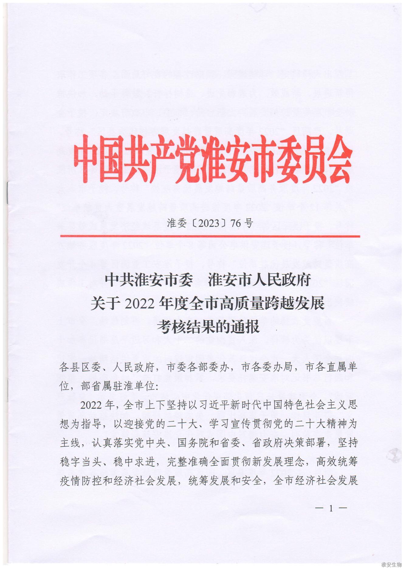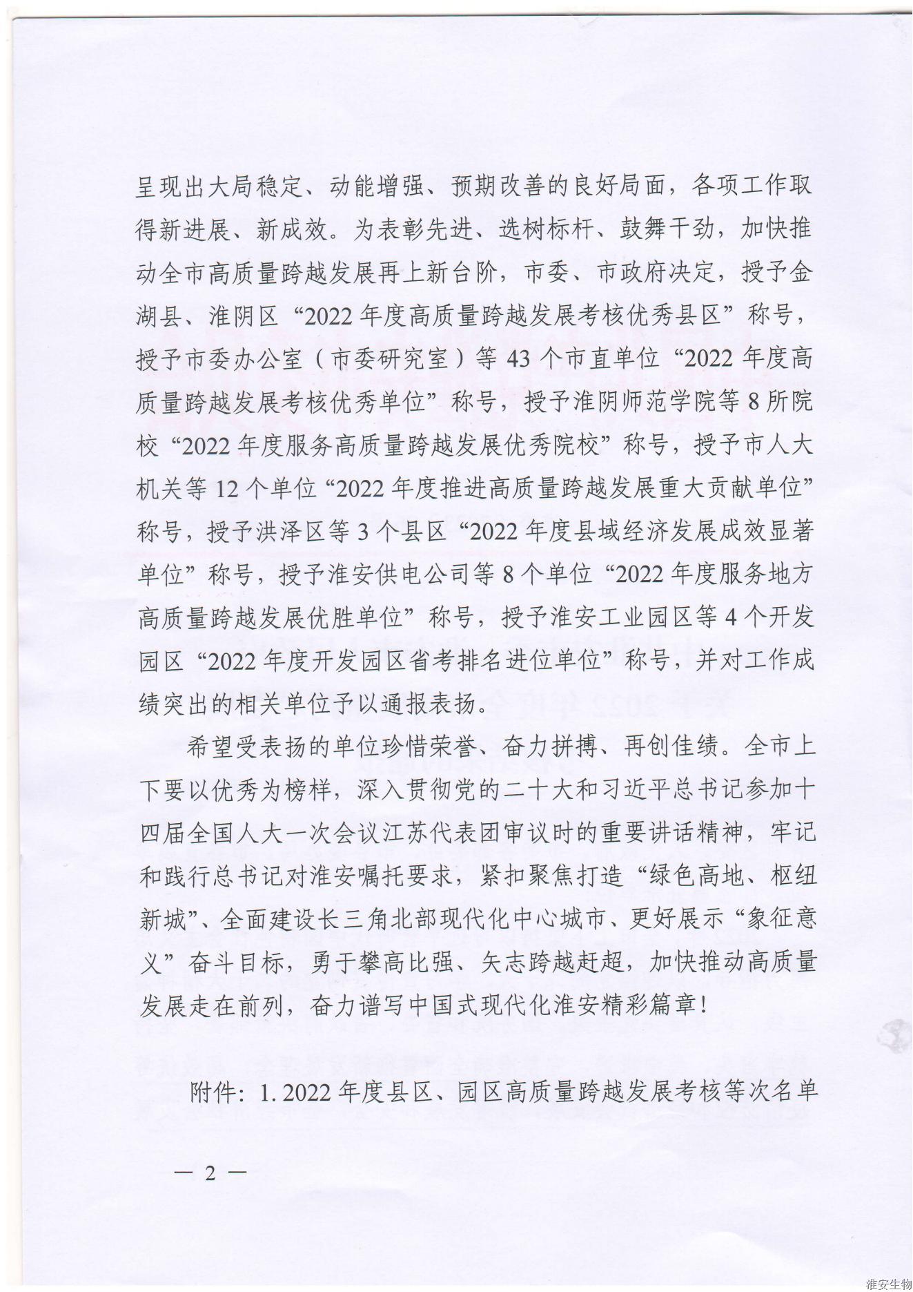 会议宣读了市委市政府关于2022年度全市高质量跨越发展考核结果的通报。淮安生物工程高等职业学校获得在淮大中专院校服务高质量跨越发展考核优秀等次,实现“双连冠”。