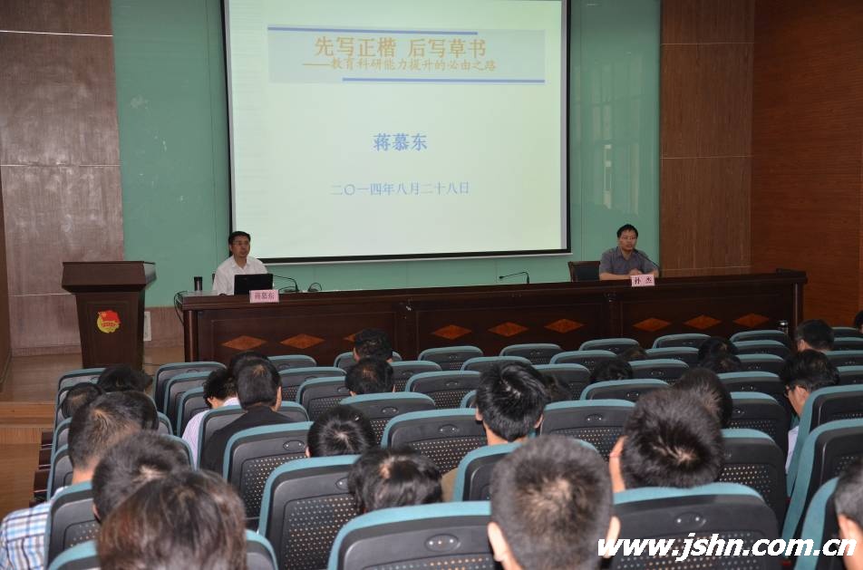 8月28日上午,淮安信息职业技术学院高教研究所蒋慕东博士以《先写楷书,再写草书——教育科研能力提升的必由之路》为题讲解了职业教育的老师应如何提升自己的教科研能力。他希望教师要做学习型、研究型、实践型、创新型、智慧型的“五型”教师;在课题研究上,要先写楷书,即先从校级、市级课题做起,学习规范,再写草书,即在规范的基础上,结合申报省级、国家级课题,努力提升教科研水平;他还要求教师要树立八种意识和八项行动,即大局意识和全局意识、学习意识与学习行动、问题意识与课题凝炼、方法意识与方法选择、合作意识与团队组织、借鉴意识与文献综述、创新意识与创新路径、精品意识与课题设计。他还介绍了研究的经验,弄清楚是什么?为什么?做什么?怎么做?怎么做到位?养成“随手记”的习惯,注意以新视角、新观念、新思维探索和解决新矛盾、新问题,开展真研究,取得真成果。