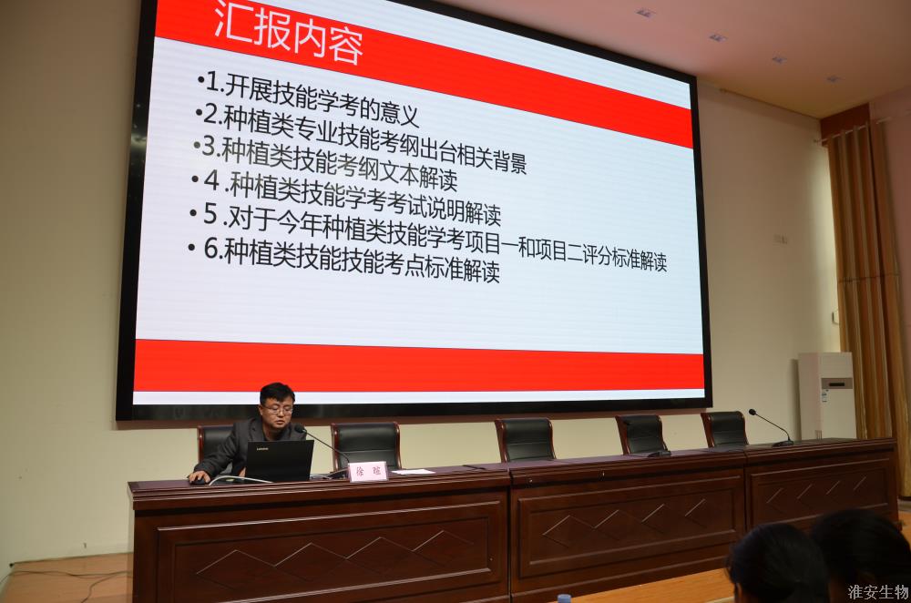 10月17日, 江苏省中等职业学校种植类技能学业水平考试骨干教师培训在农业实训中心124会议室举行。副校长李慧、盐城生物工程高等职业技术学校董晓鸣副教授、植物工程系主任徐暄、副主任顾艳以及全省40多名专业骨干老师参加了此次培训。会议由江苏省学考种植类研究组副组长吴松主持。