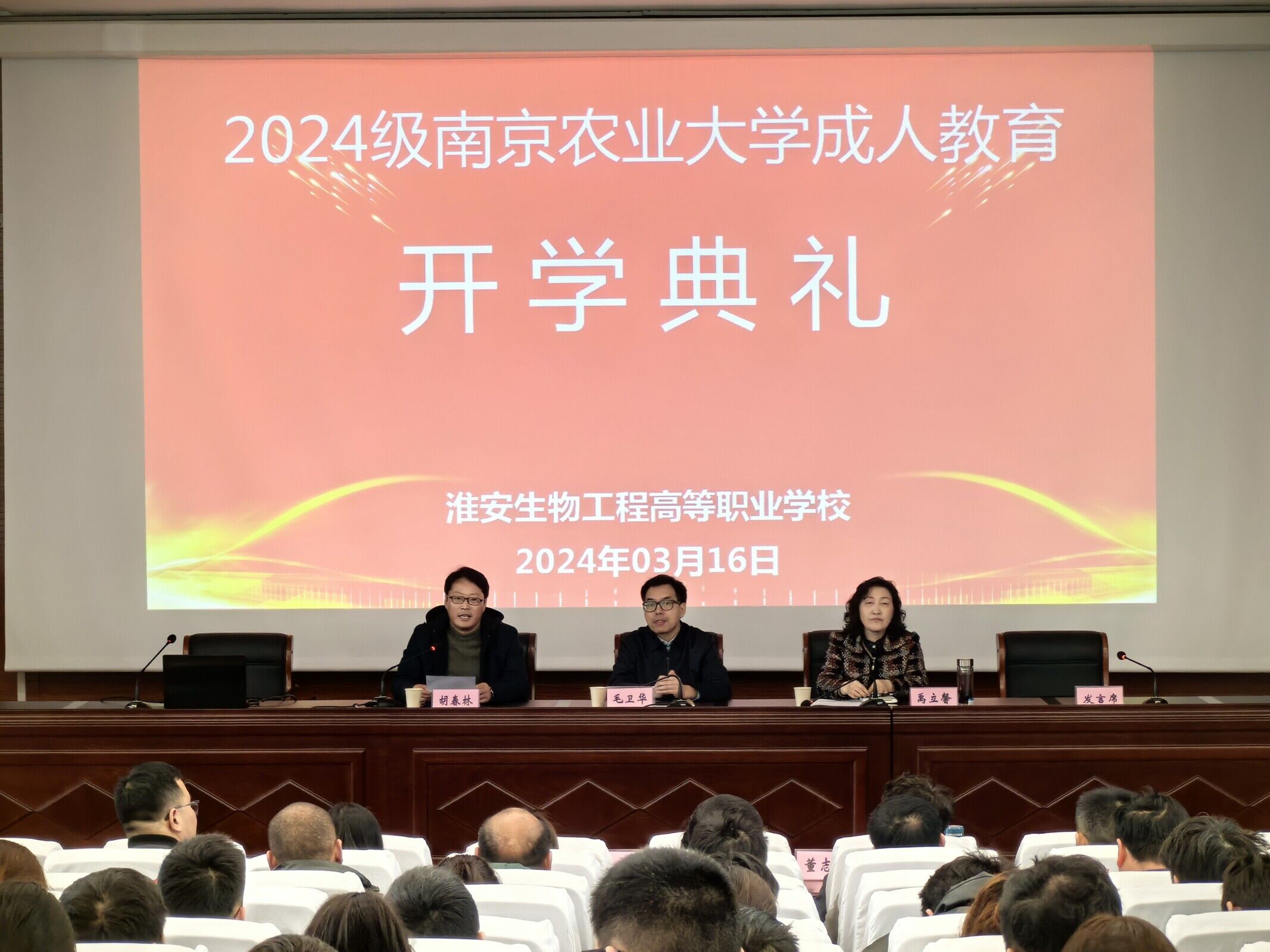 春天的钟声敲响,开学季的序幕拉开。3月16日,2024级南京农业大学成人教育新生开学典礼在淮安生物工程学校报告厅举行,南京农业大学继续教育学院院长毛卫华、淮安生物工程学校副校长禹立馨出席典礼,2024级全体新生、各班主任及任课教师代表参加典礼。
