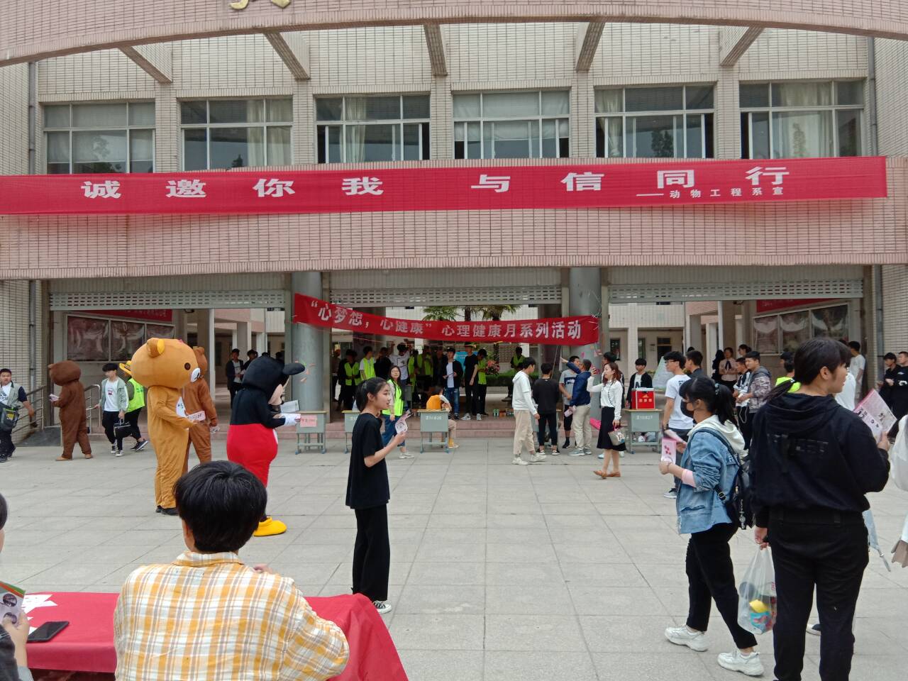 5月15日下午,我系在主教一楼大厅开展“心梦想,心健康”爱的抱抱心理健康主题教育活动,四位身穿卡通人偶服装的同学站在主教前的广场上,与前来参加活动的老师、同学热情拥抱,并鼓励陌生同学之间相互拥抱,打破陌生界限,感受温暖。