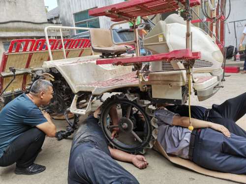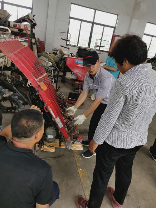 6月11日至12日上午,服务小组共修理了5台插秧机,保养了2台收割机,更换了部分插秧机的插植臂和秧针等零部件,并检查调整了标准取苗量等技术参数,对有液压故障和底盘严重漏油的两台机具,经服务小组专家“会诊”排除了故障。在维修服务的过程中,服务小组成员同时传授维护保养知识,有效增强了机手的机务管理能力。维修大师高阳一身泥一手油地为机手服务,体现了农机工匠的责任和担当;洋马公司向合作社赠送了维护保养油品和部分插植易损件,获得了用户好评。服务结束后,省服务站在现场召集合作社成员、市区镇农机管理人员、生产企业技术人员、维修能人等进行了座谈,就农机维修服务、农机培训等工作进行了交流。