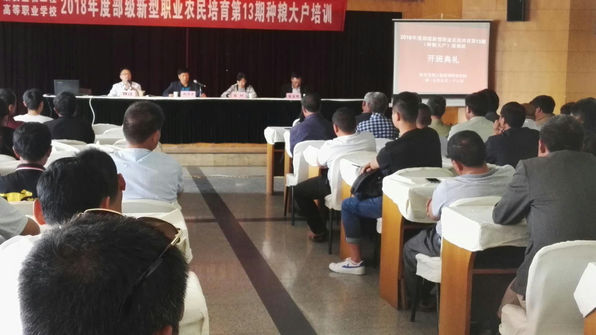 为乡村振兴凝聚合力,促进农民合作组织健康发展,根据苏农科【2018】17号《关于做好2018年中央财政农业生产发展(新型职业农民培育)项目的通知》要求,我校于5月23日~30日举办第13期农业部新型职业农民培育培训班。淮阴区100多名种粮大户新型农业经营主体带头人参加培训。23日上午培训班在淮阴区淮阴宾馆开班,开班仪式由成教处刘江处长主持,赵守东副校长致辞并详细介绍学校办学情况,淮阴区农业农村局总农艺师苗环就本次培训班的意义和要求作重要讲话。