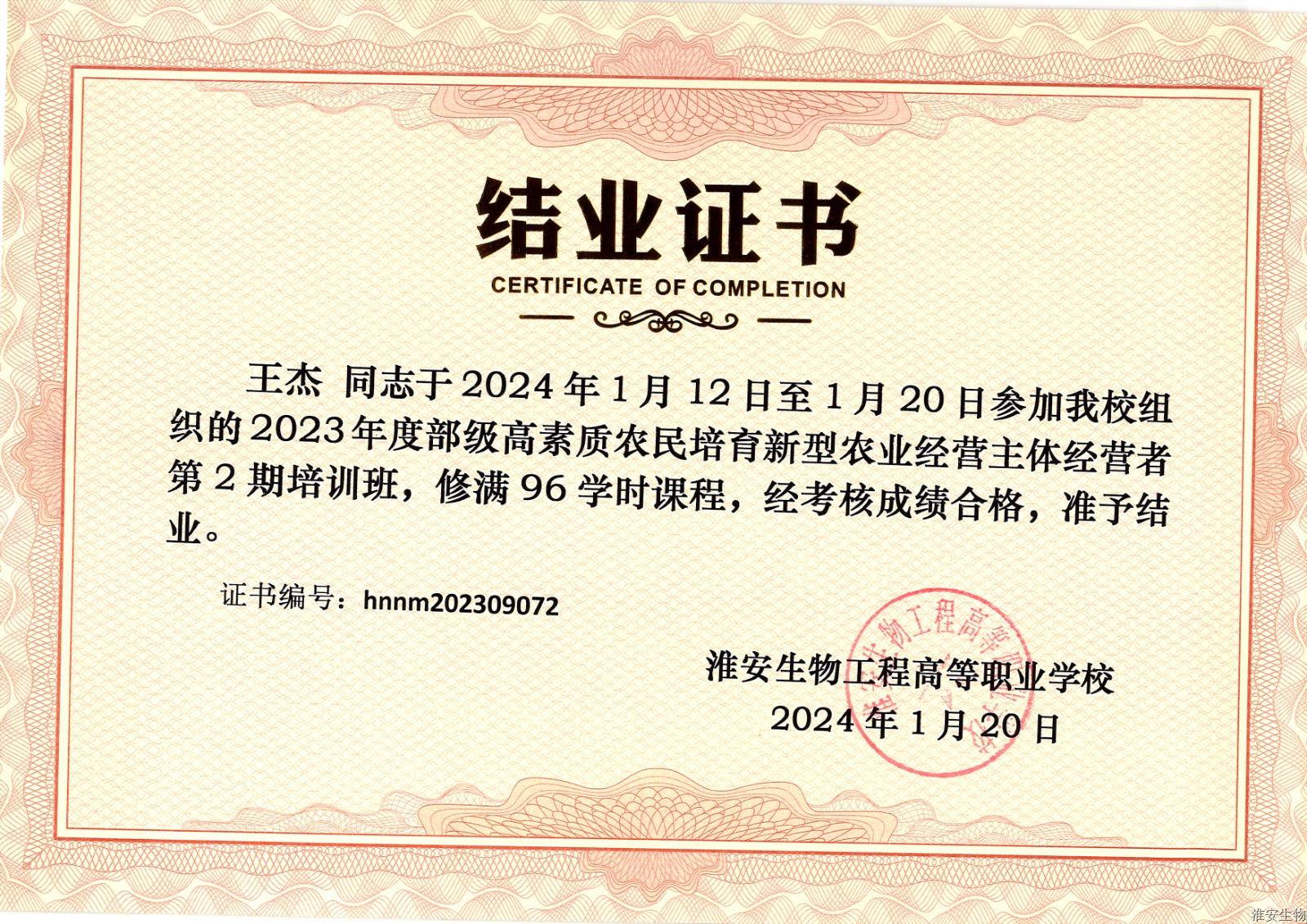 目前创业有成的王杰仍然不忘初心,坚持学习,在今年的1月12-20日期间,他又主动参加了淮安生物工程学校举办的为期9天的2023年度部级高素质农民培育新型农业经营主体经营者第2期培训班,并取得了结业证书。