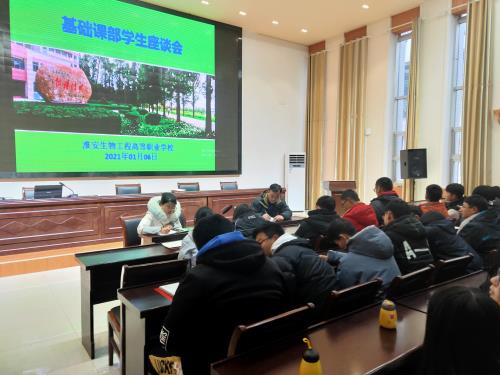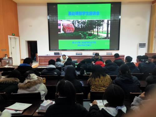 1月6日晚7点30分,基础课部在新农业实训楼124召开座谈会会,系部副主任朱庆胜、彭敏玲、18级(3+4)班全体学生参加了本次座谈会。