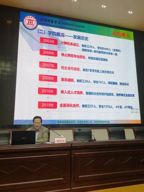 10月23日下午3点,陈伏兵教授在新农业实训楼124召开应用型计算机人才培养讲座。陈教授是省计算机学会、省人工智能学会理事、淮阴师范学院计算机科学与技术学院院长。当天聆听讲座的是3+4微机班和计算机专业的学生。