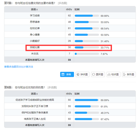 家长对于孩子身心发展更加重视,这符合一般家长的特点,但是机电系优势是技能比赛、创新比赛,只有33%的家长勾选,我们应当适当在家长中宣传系部特色和长处,家长的重视和认可会更加方便我们开展学生技能训练工作。