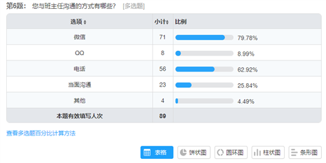调查发现与班主任沟通的渠道主要是微信和电话,年轻人用QQ较多,但是家长们主要是微信,家长群应以微信群为主。