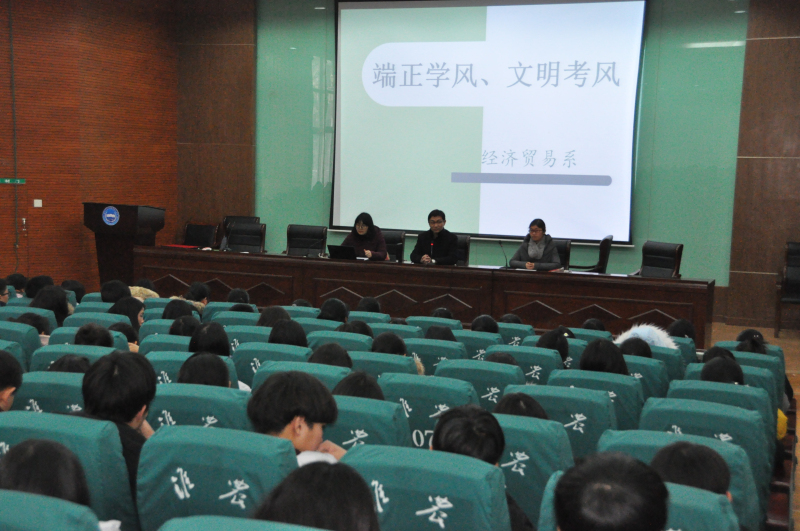 为了加强和促进我系学风、考风建设,营造良好的学习氛围,动员学生诚信应考,1月16日下午,经济贸易系全体同学在多功能报告厅召开了“加强学风建设,严肃考风考纪”教育大会,会议由两个议程组成。