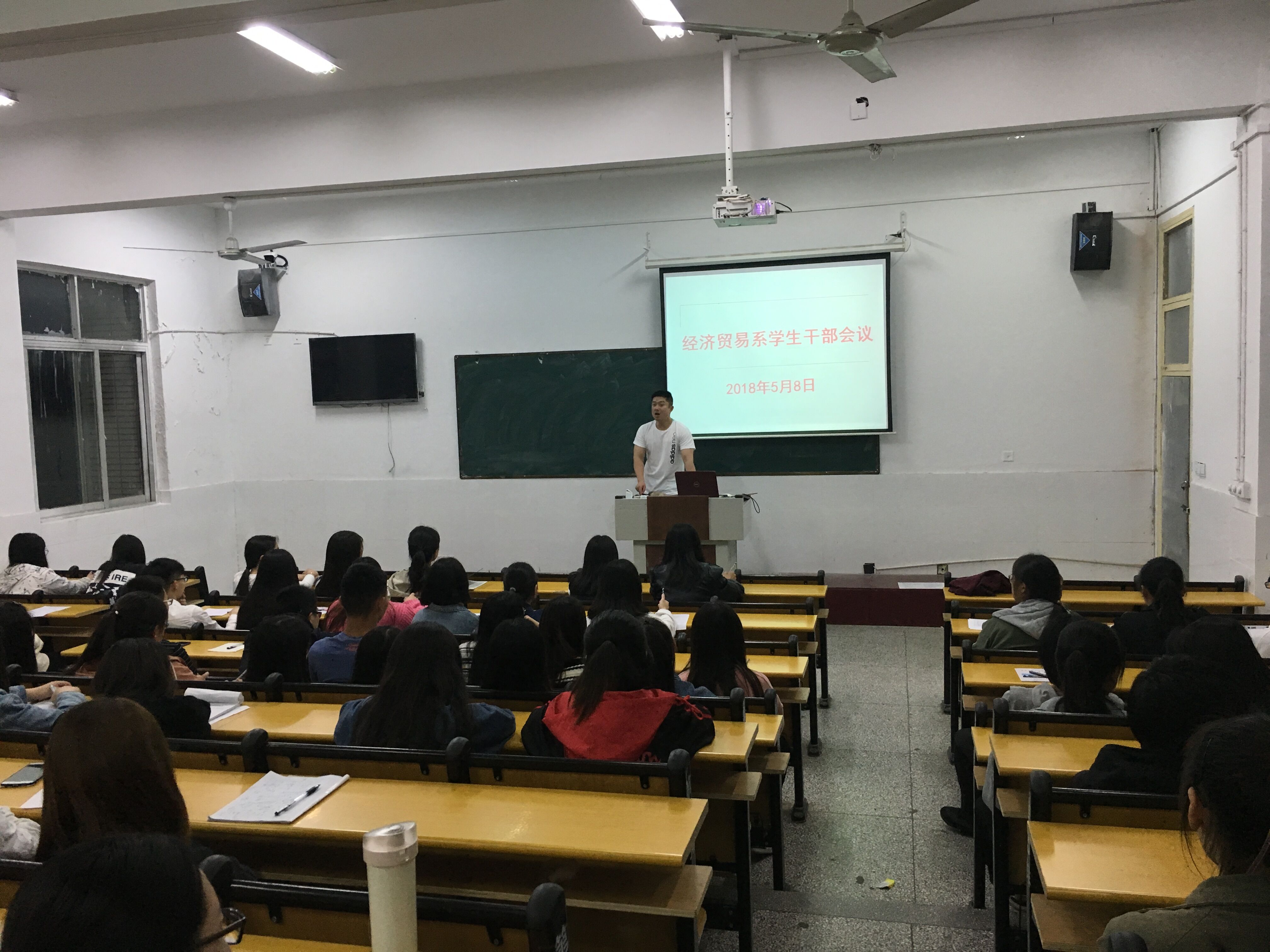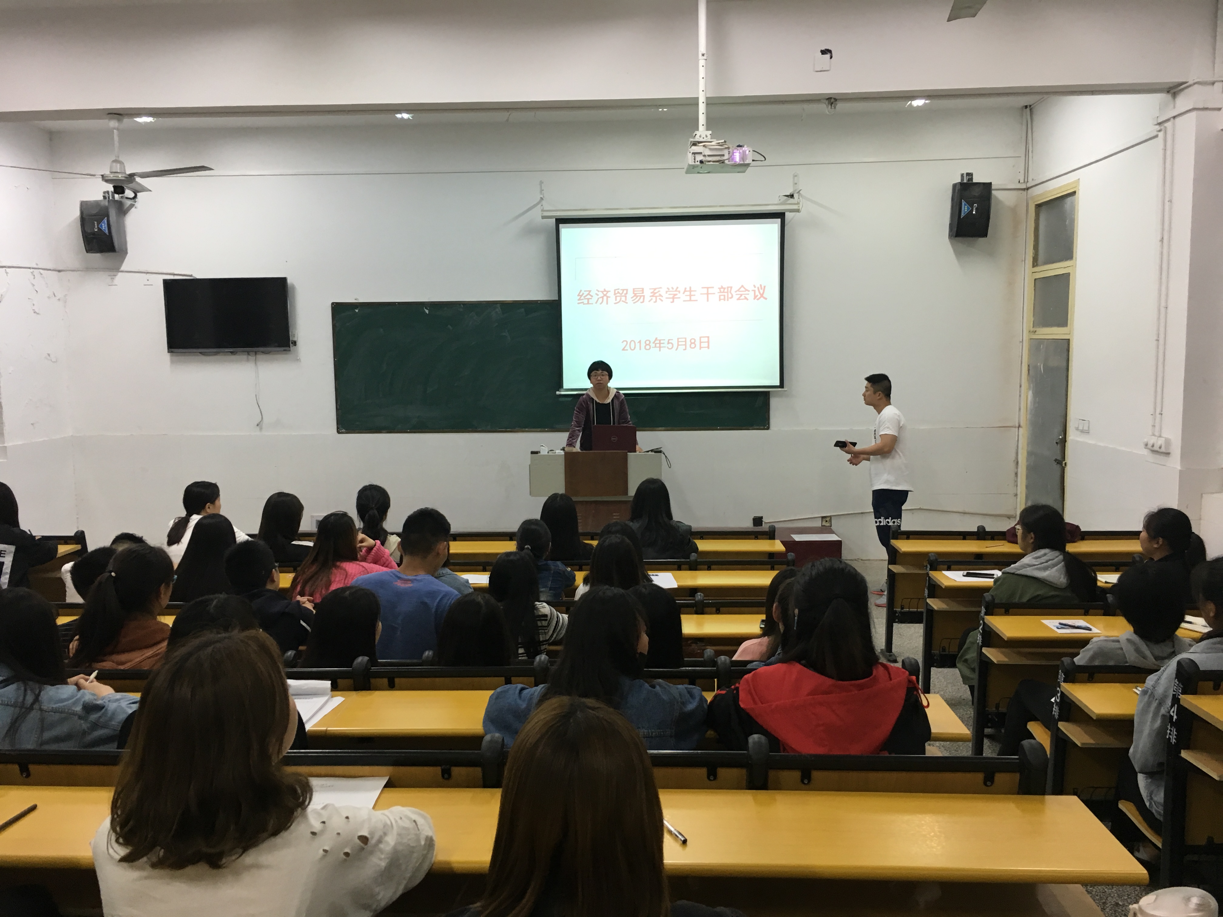 5月8日晚,经济贸易系在主109教室召开了经济贸易系学生干部会议,会议由经济贸易系副主任宣文秀同志主持,陈云昌、卞新博两位老师及系学生干部参加了会议。