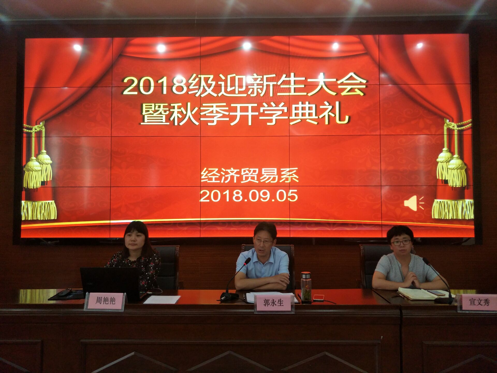 9月5日下午,经济贸易系2018级迎新生大会暨秋季开学典礼在多功能报告厅举行。系主任郭永生、副主任宣文秀、主任助理周艳艳出席了会议,2018级全体新生和16、17级老生参加了此次教育大会。会议由系学生管理老师荣新星主持。